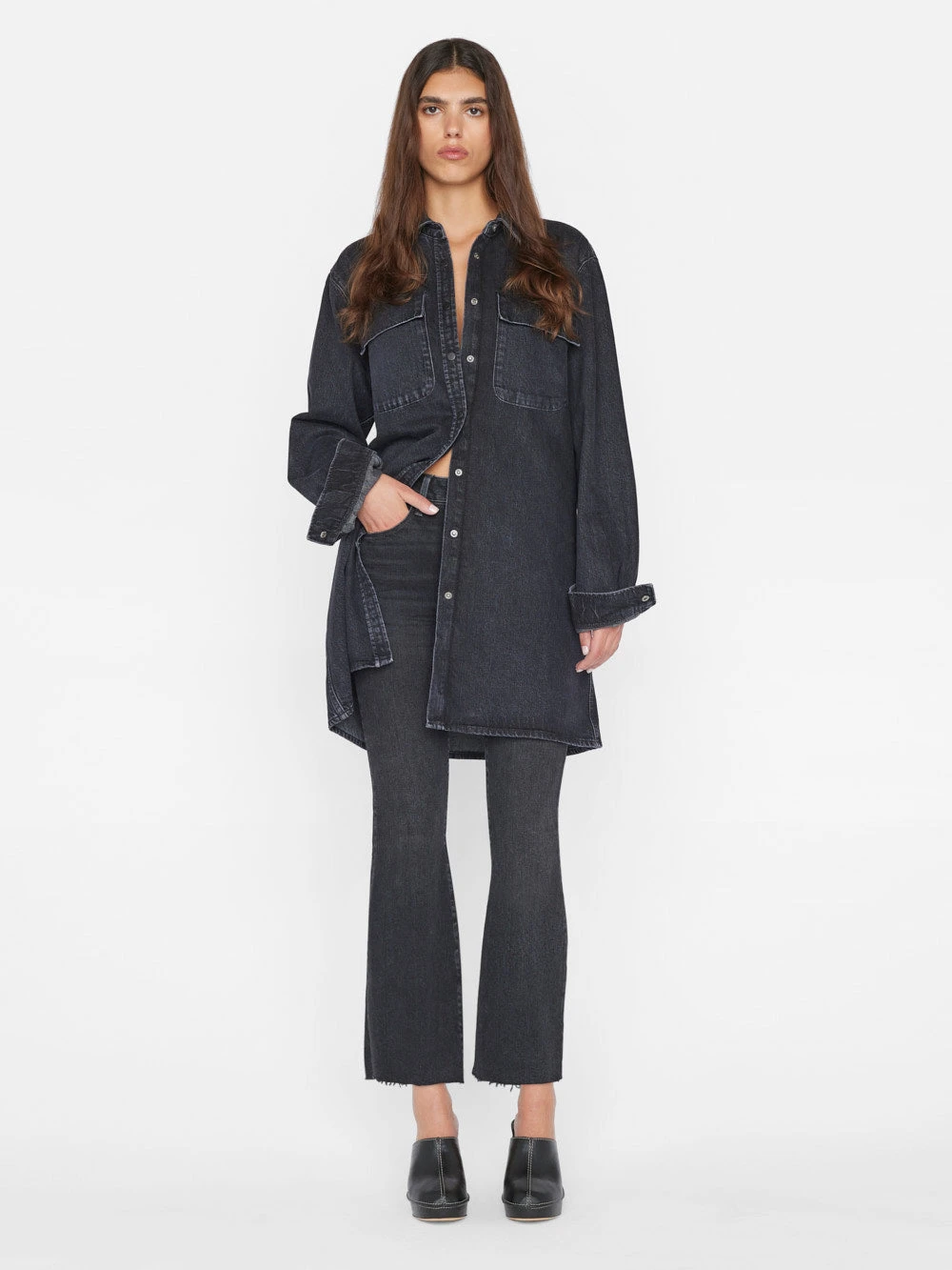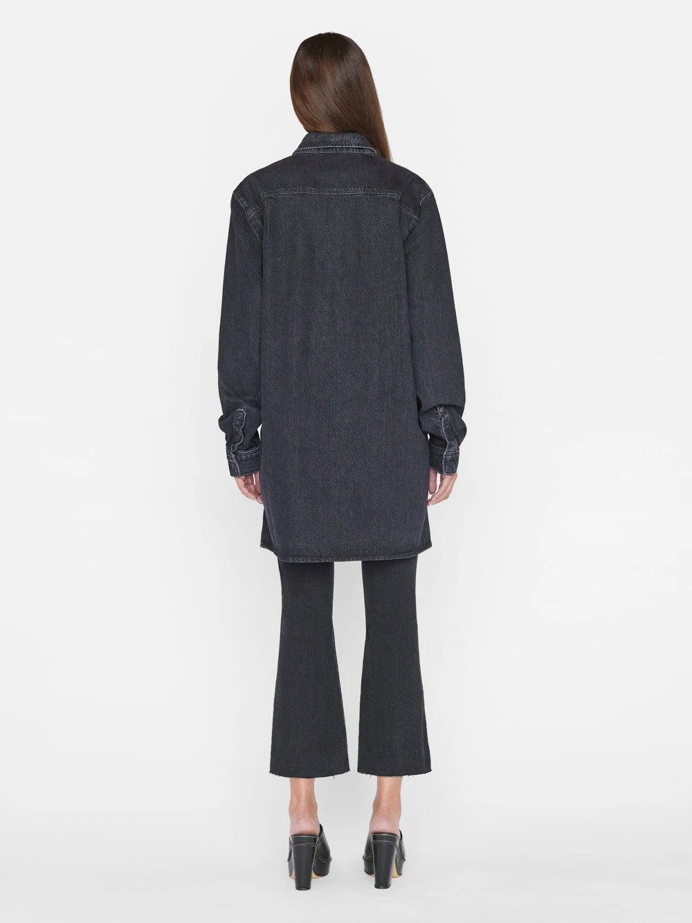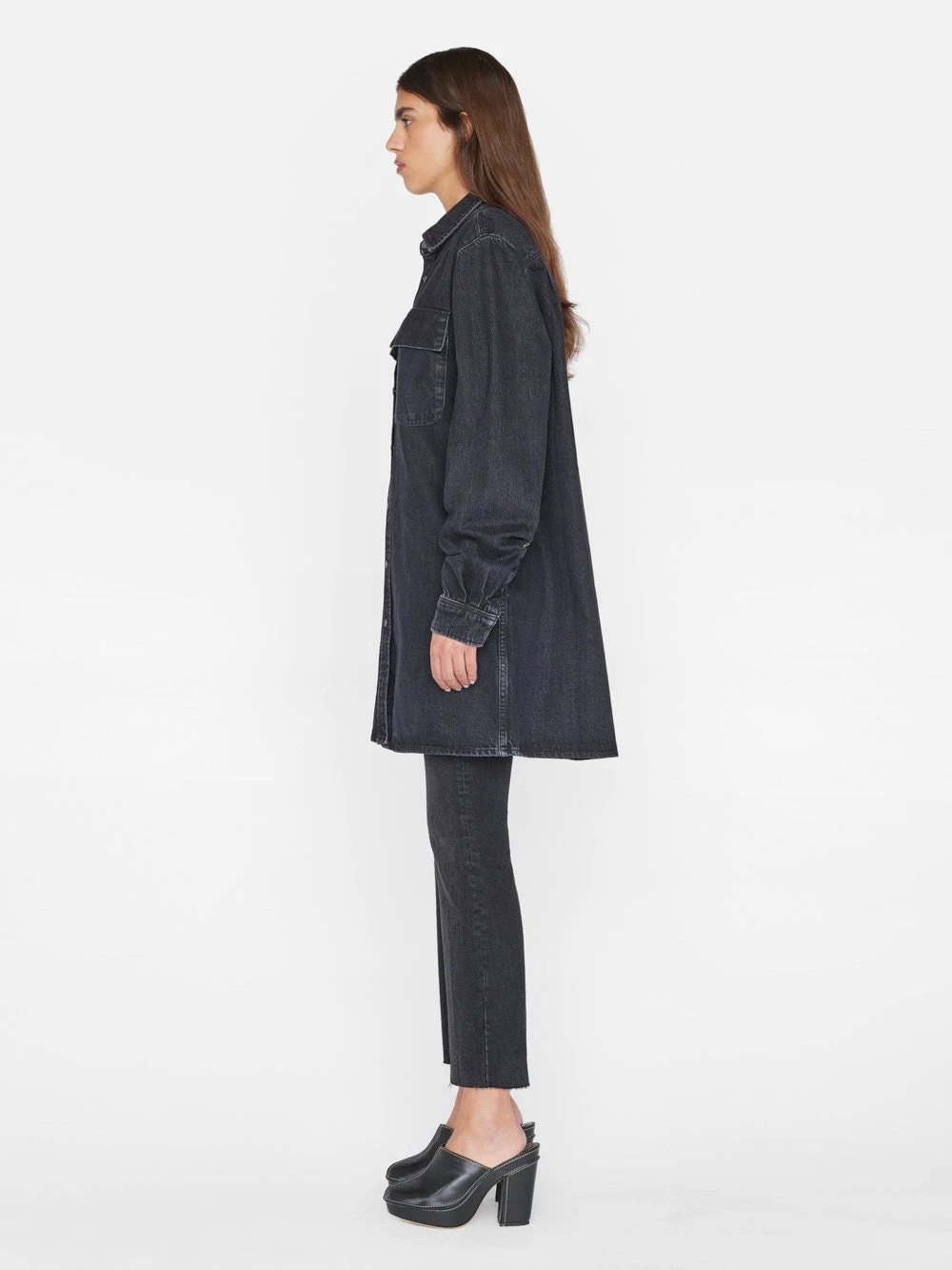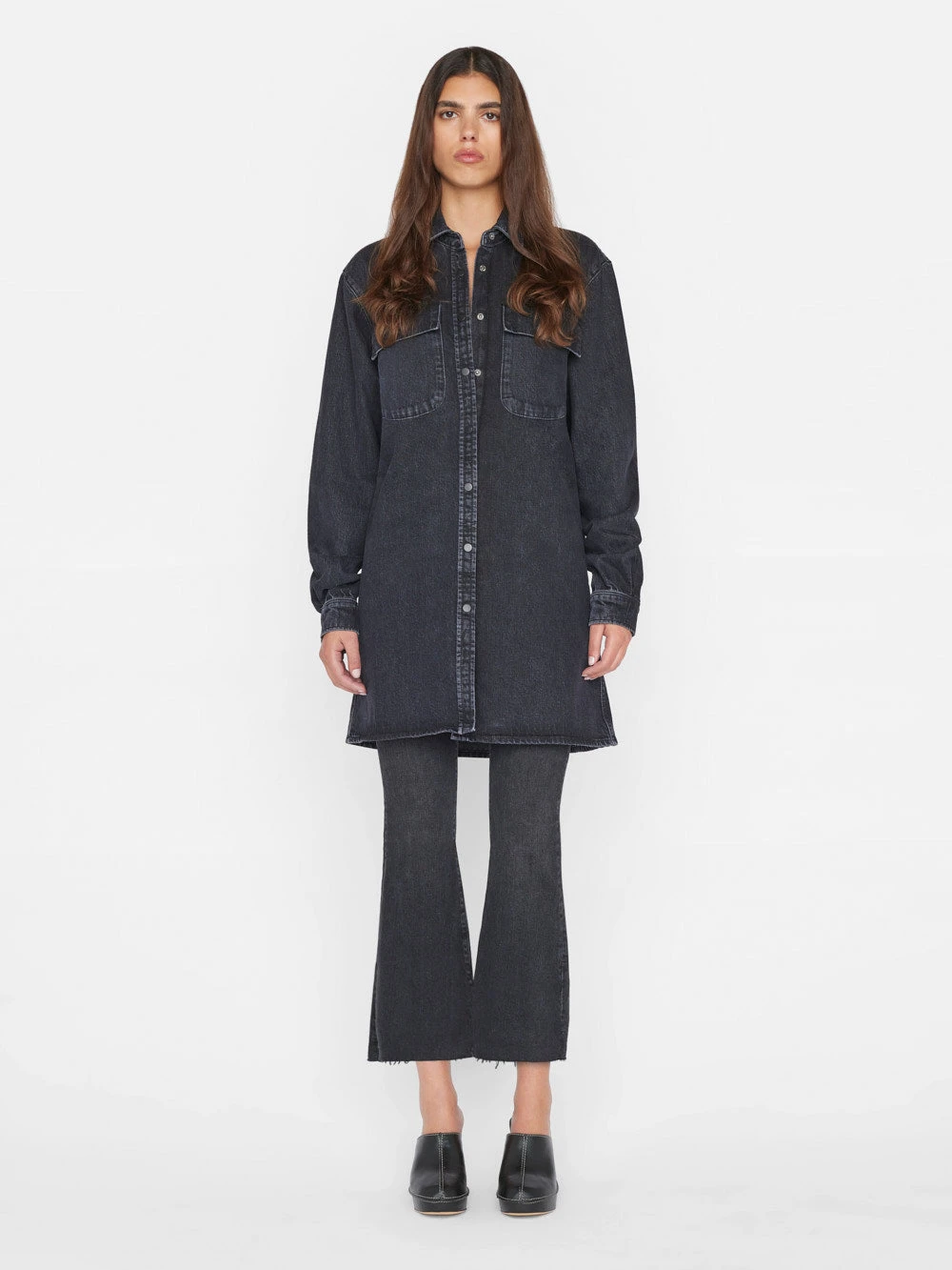 Denim shirt dress with button down closure, front flap pockets, and cinched cuffs. Crafted from a rigid sustainable denim that breaks into a beautiful lived-in feel. Style as is or pair with your favorite denim silhouette for an unexpected layered look.