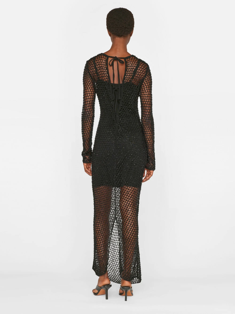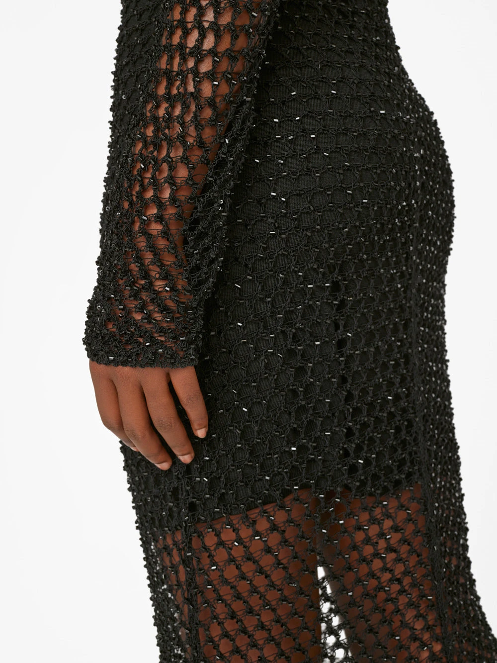 This striking open-weave dress pairs a long-sleeve maxi length style over a mini-length slip for a sophisticated take on the mesh-dressing trend. Glittering beads are hand-woven into the crochet for a little sparkle. Features a tie neck closure.