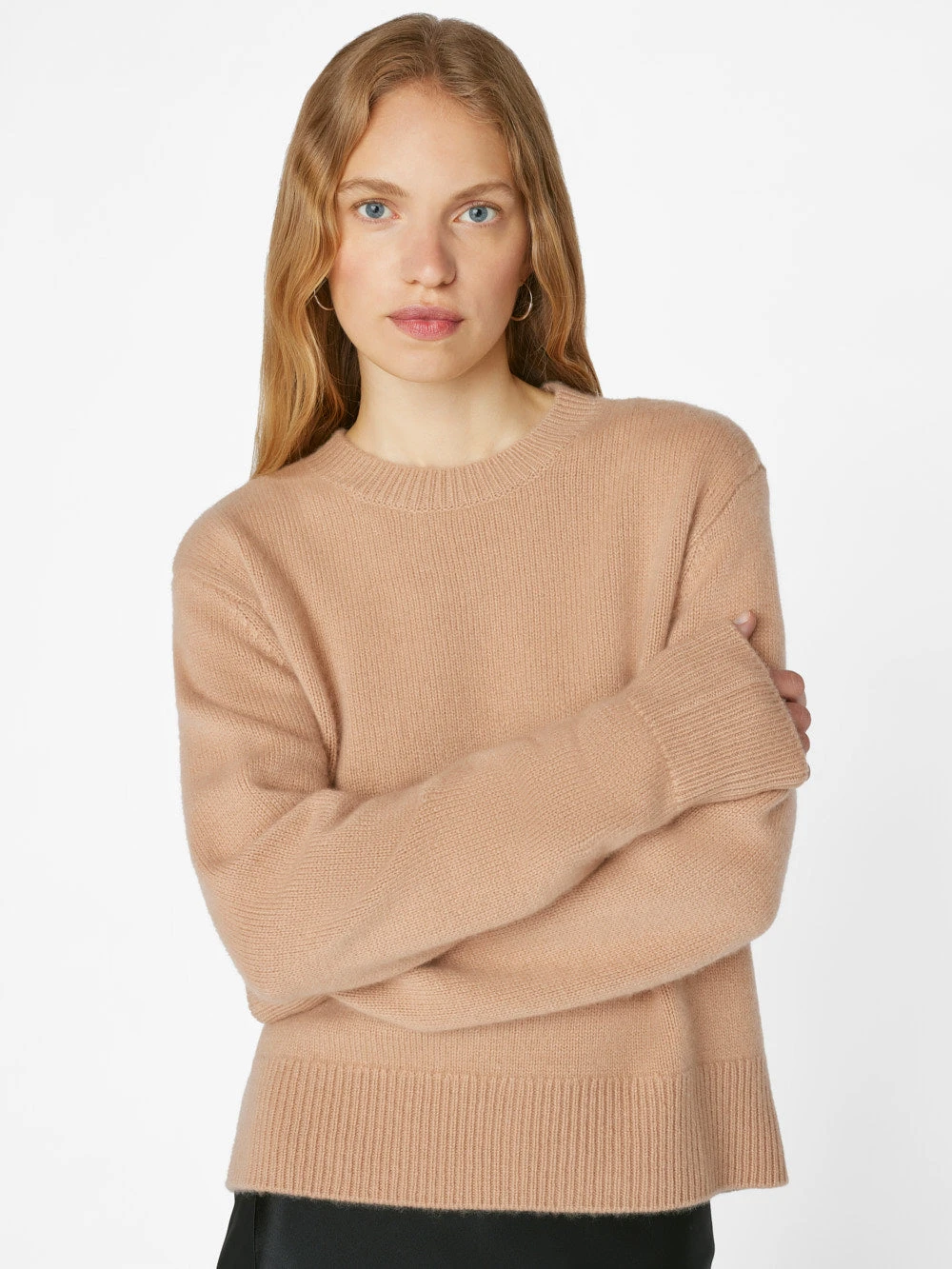 Bestselling FRAME sweater with a slim silhouette, ribbed crewneck, hem, and cuffs—size up to achieve an oversized fit as shown on model. Crafted from soft 100% cashmere with the plushest hand.