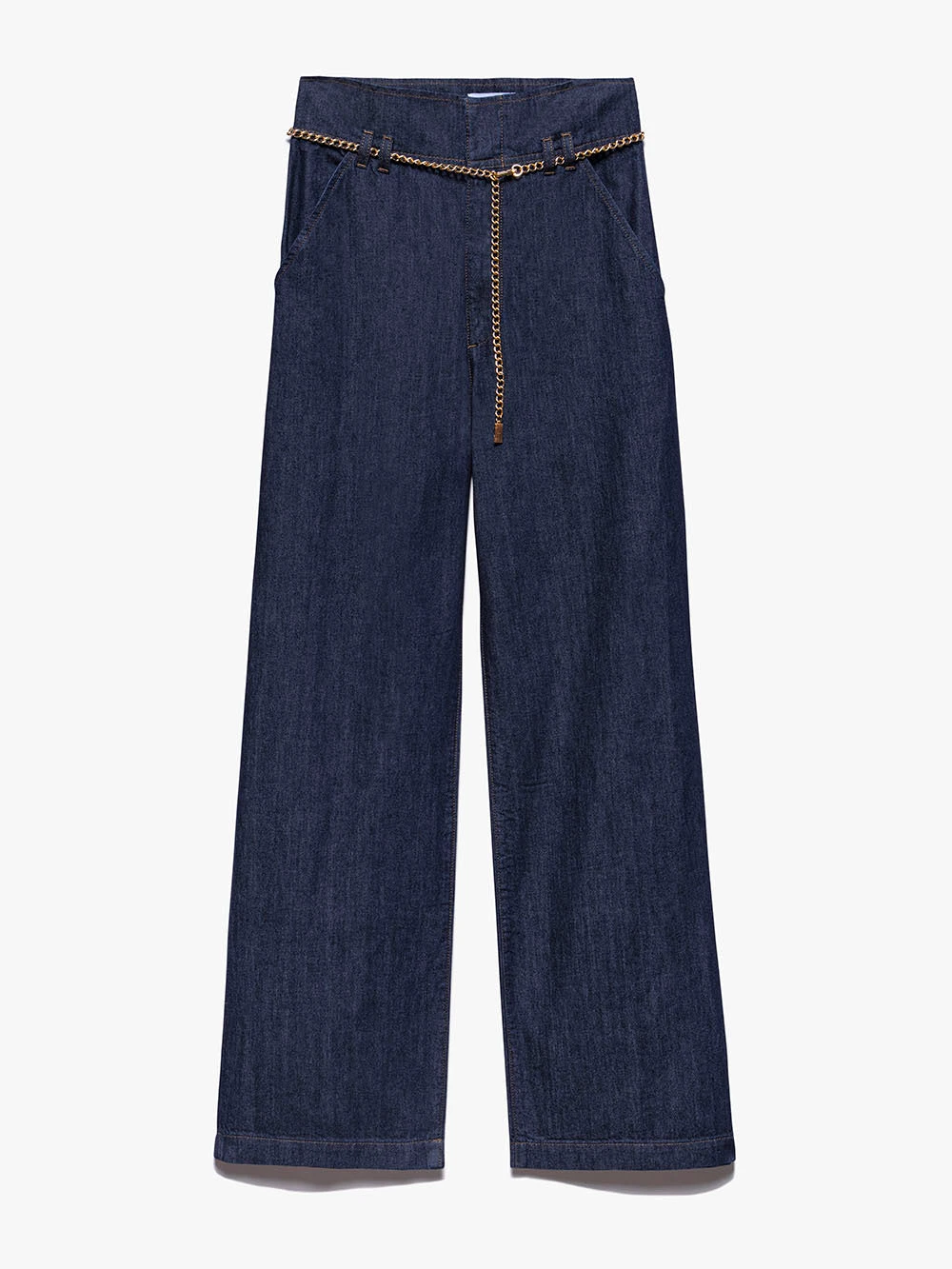 Please note: This is a Sale style. A $12 restocking fee applies for any return that includes Sale styles, deducted from the refund total. We gave this high rise, wide leg jean a cinched waist with a sleek gold chain belt. Done in a dark indigo wash, this streamlined fit accommodates every top in your wardrobe. .
