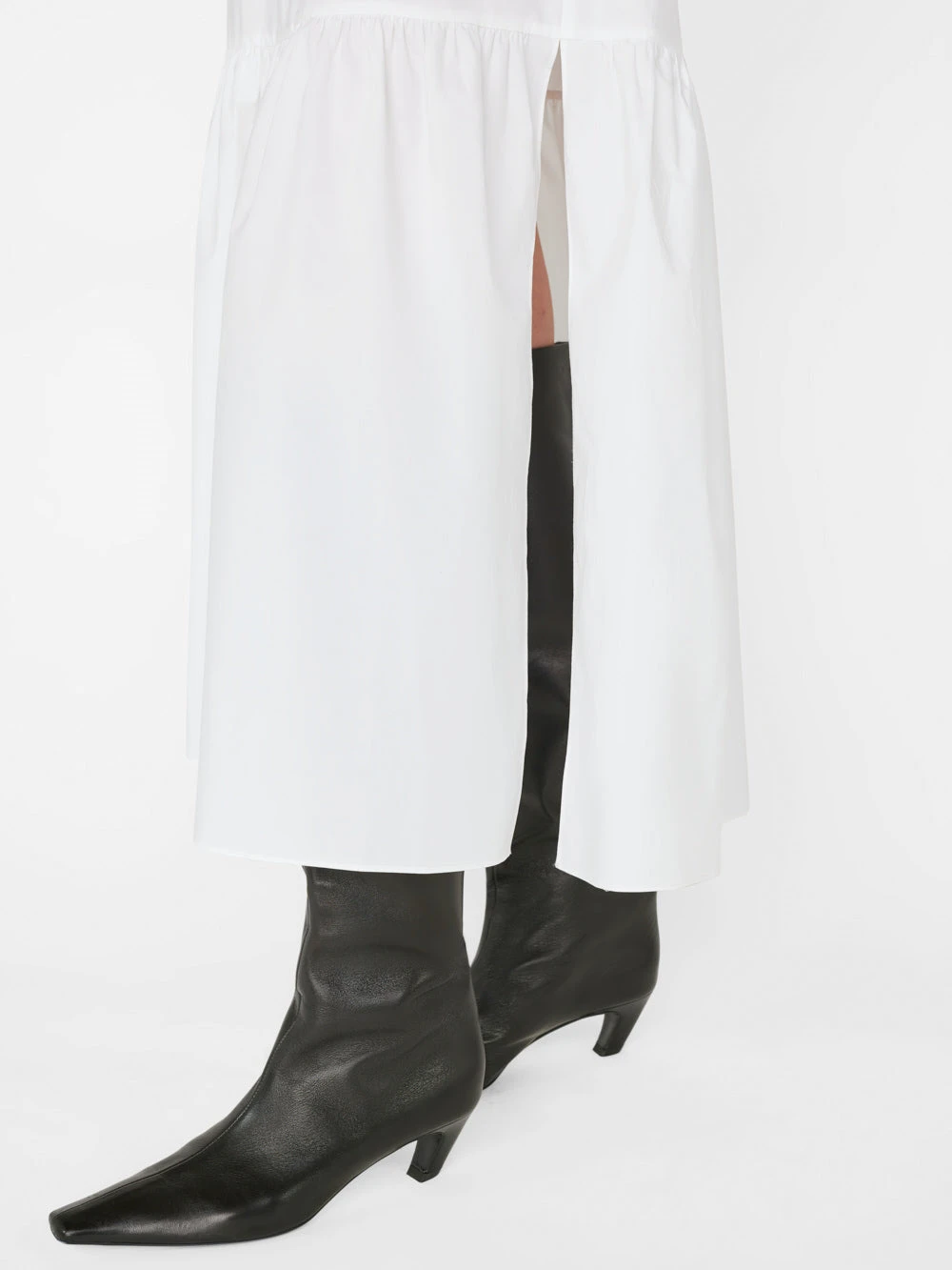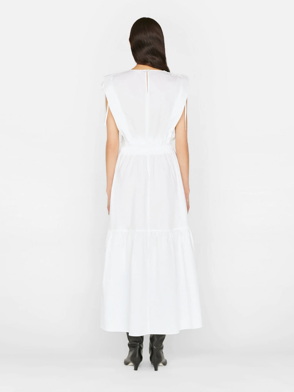 Please note: This is a Sale style. A $12 restocking fee applies for any return that includes Sale styles, deducted from the refund total. Get summer party ready in a bright, crisp, 100% cotton poplin midi dress with plenty of feminine details. Slim architectural panels of poplin cover the shoulders and can be cinched and tied in a bow, and ruching at the waist creates a flattering, comfortable fit. The tiered skirt features side slits for ease and allure.