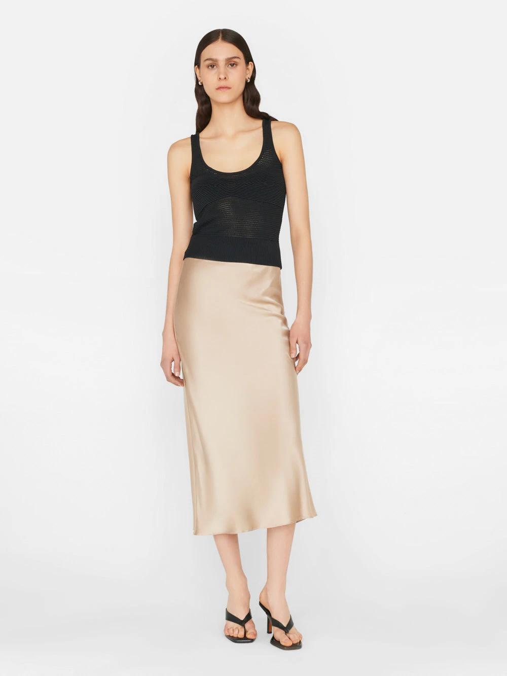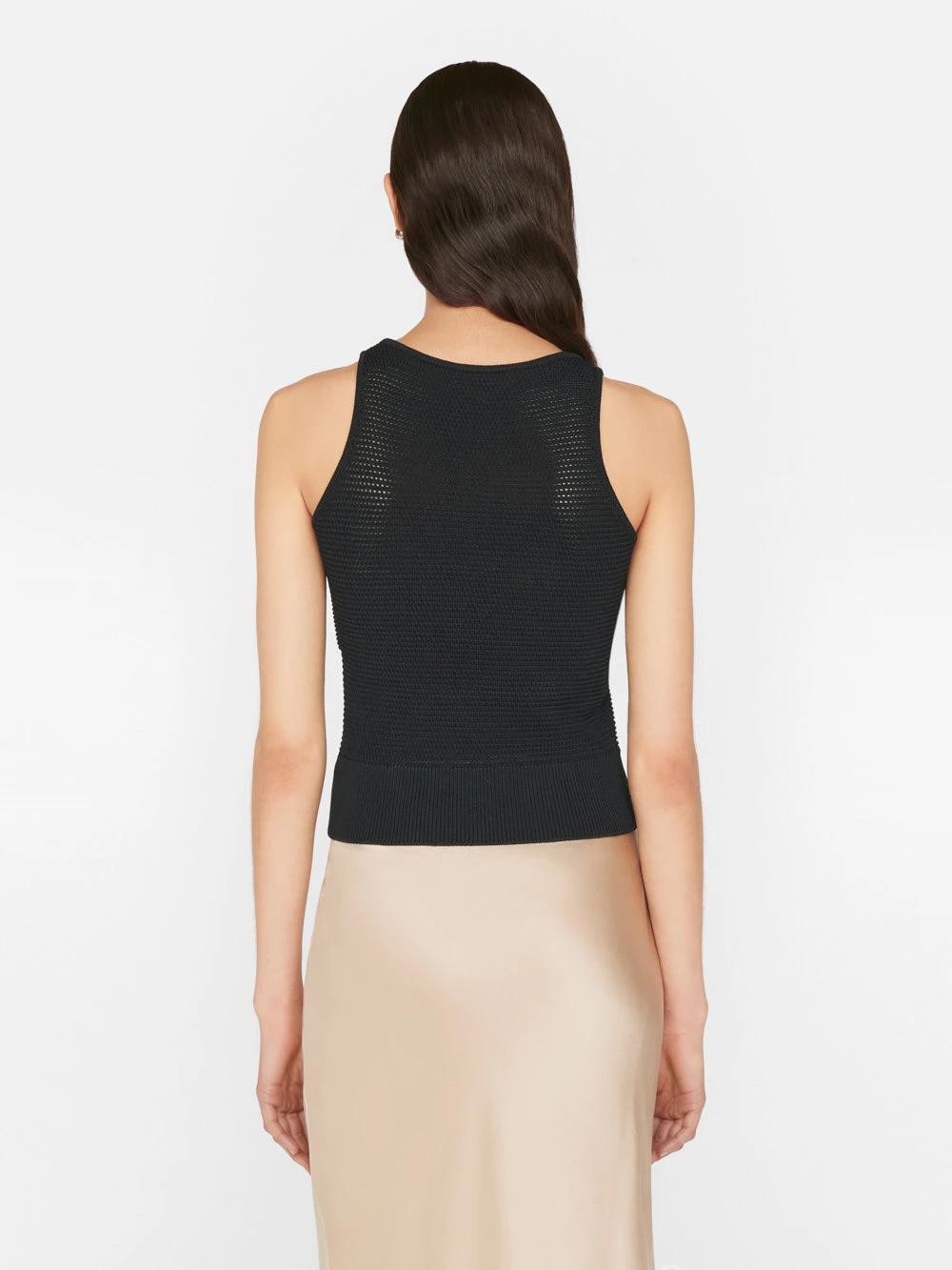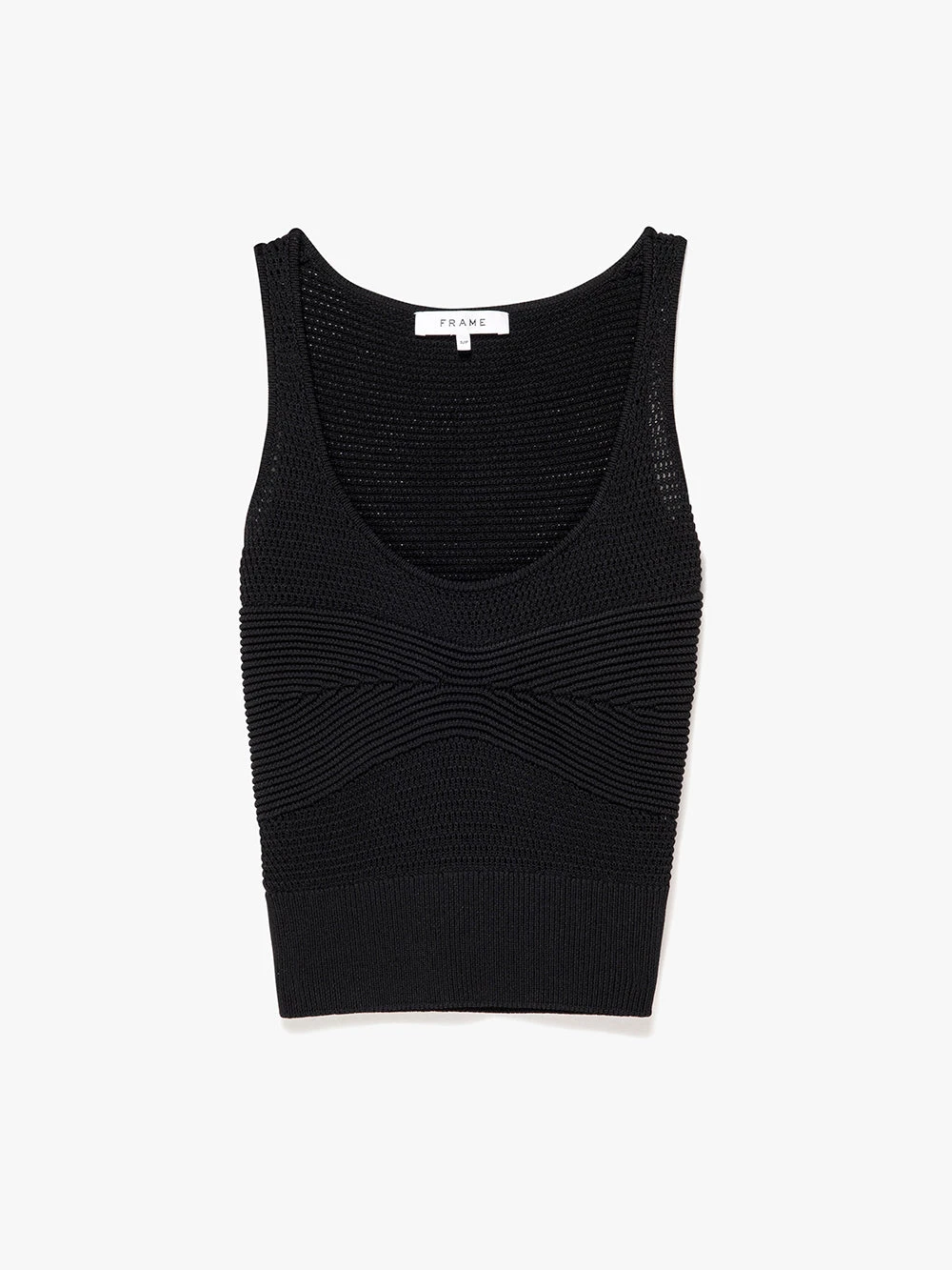 Done in Noir crochet, this tank has bra top detailing knit in just below the scoop-neck silhouette, for a chic, alluring summer look that is easy to wear—and still shows a little skin.