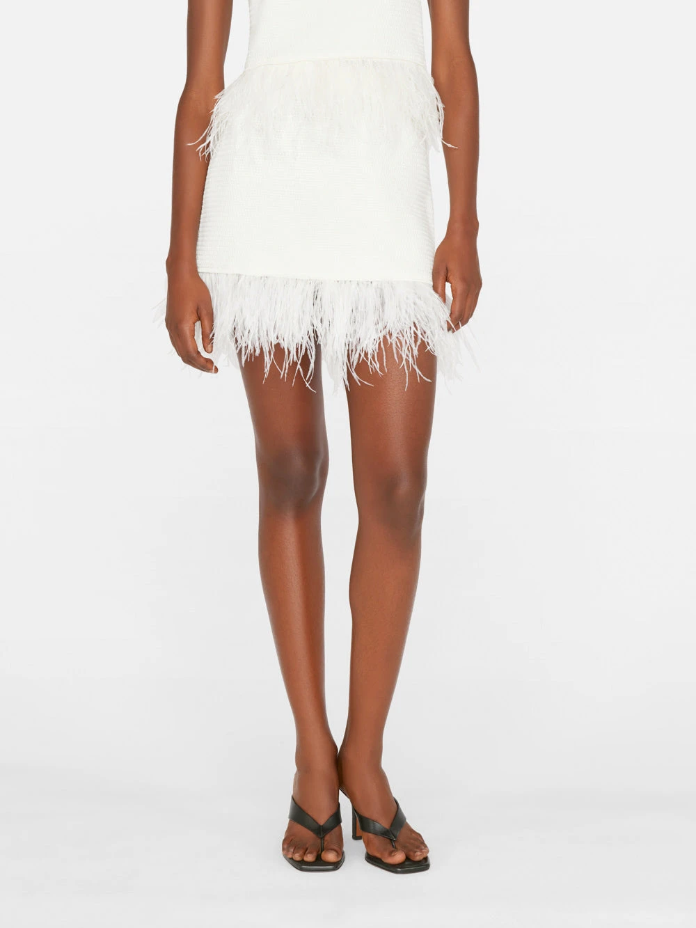 Done in a tight-weave crochet and finished with a sweep of responsibly sourced ostrich feathers at the hem, this miniskirt pairs with the matching tank to create a chic set perfect for adventures abroad, summer nights out, and sunset dinner dates.