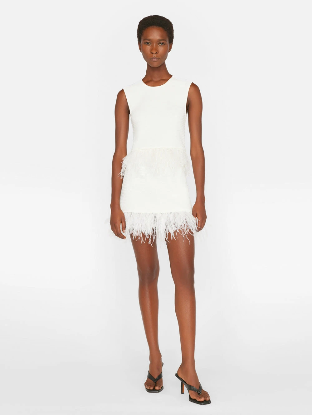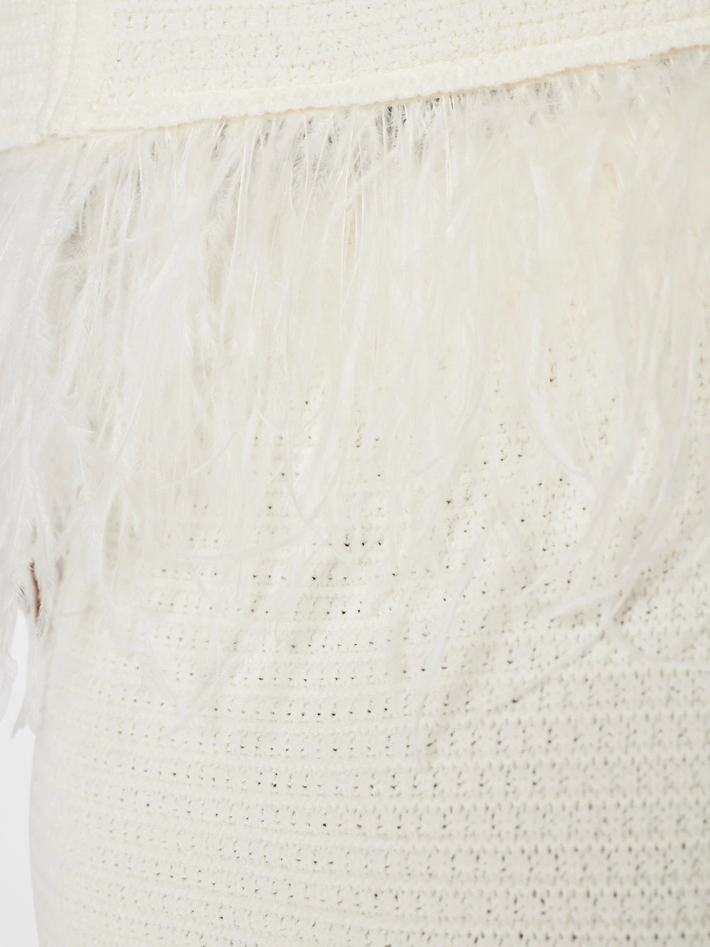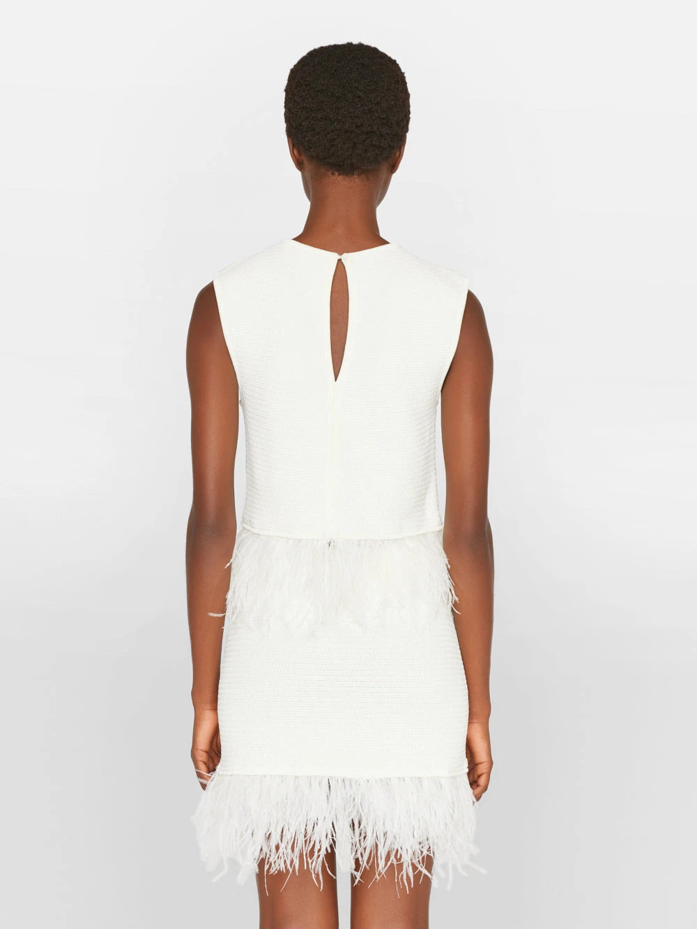 Done in a tight-weave crochet, this tank top is finished with a row of responsibly sourced ostrich feathers, for a playfully polished take on one of the summer’s most fun to wear trends. Dress it up with the matching mini, or down with light-wash denim or white cut-off shorts.