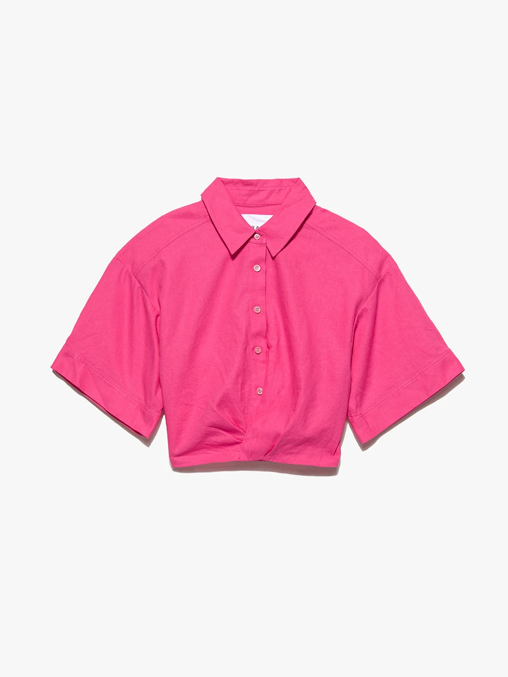Perfectly cropped and finished with a twist detail at the front hem, this short-sleeve button-down shirt is finished with an elasticized hem for a little feminine flounce. Done in the color of the season, Flamingo, pair yours with denim shorts for pool party perfection, or the matching trousers for summer polish.