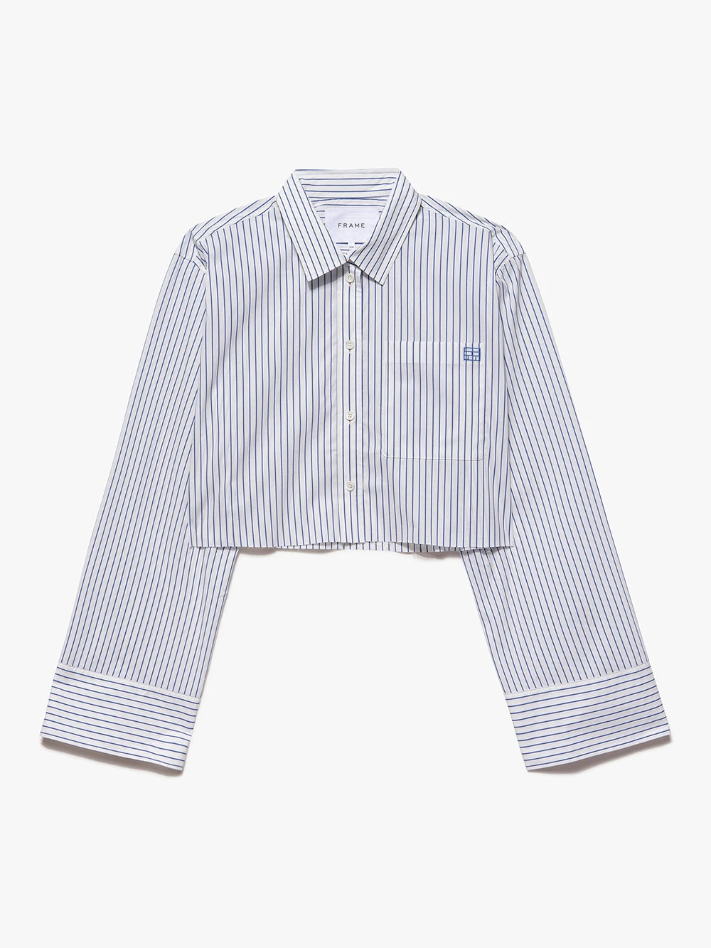 Oversized sleeves, preppy-chic Cobalt stripes, a crisp collar, and a front pocket finished with the FRAME plaque make this cropped shirt the perfect complement to lightweight denim and cut-off shorts by day, and a leather mini after dark.