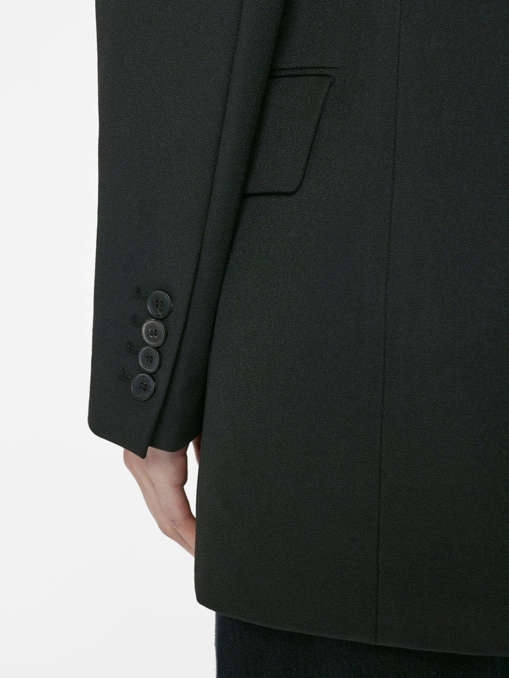 A menswear-inspired, double-breasted, four-button blazer featuring a feminine fit that darts in at the waist, functional oversized pockets, and a beautiful neckline that offers clean, modern lines. Crafted from a sophisticated suiting fabric that lends an airy drape to any silhouette.