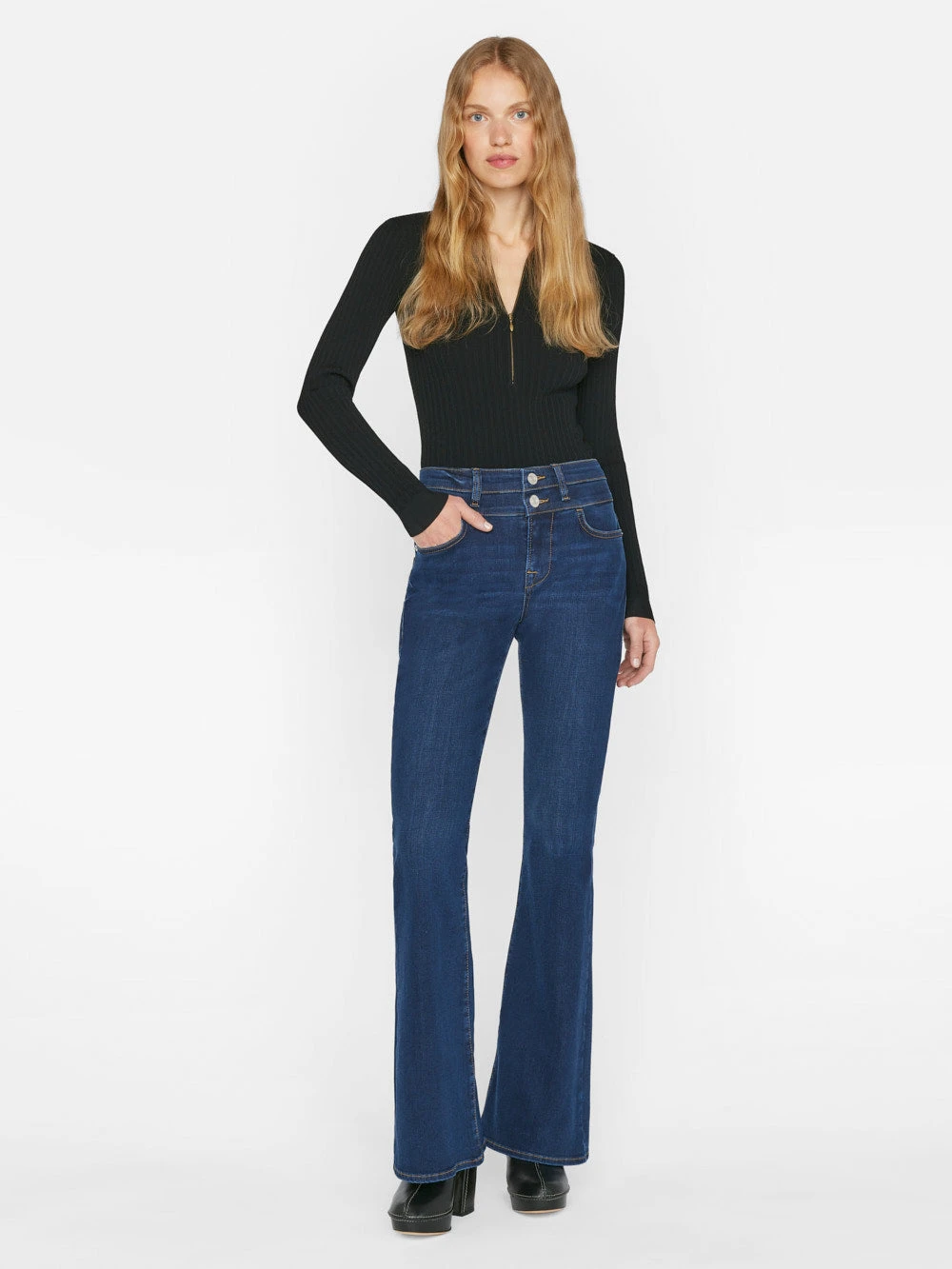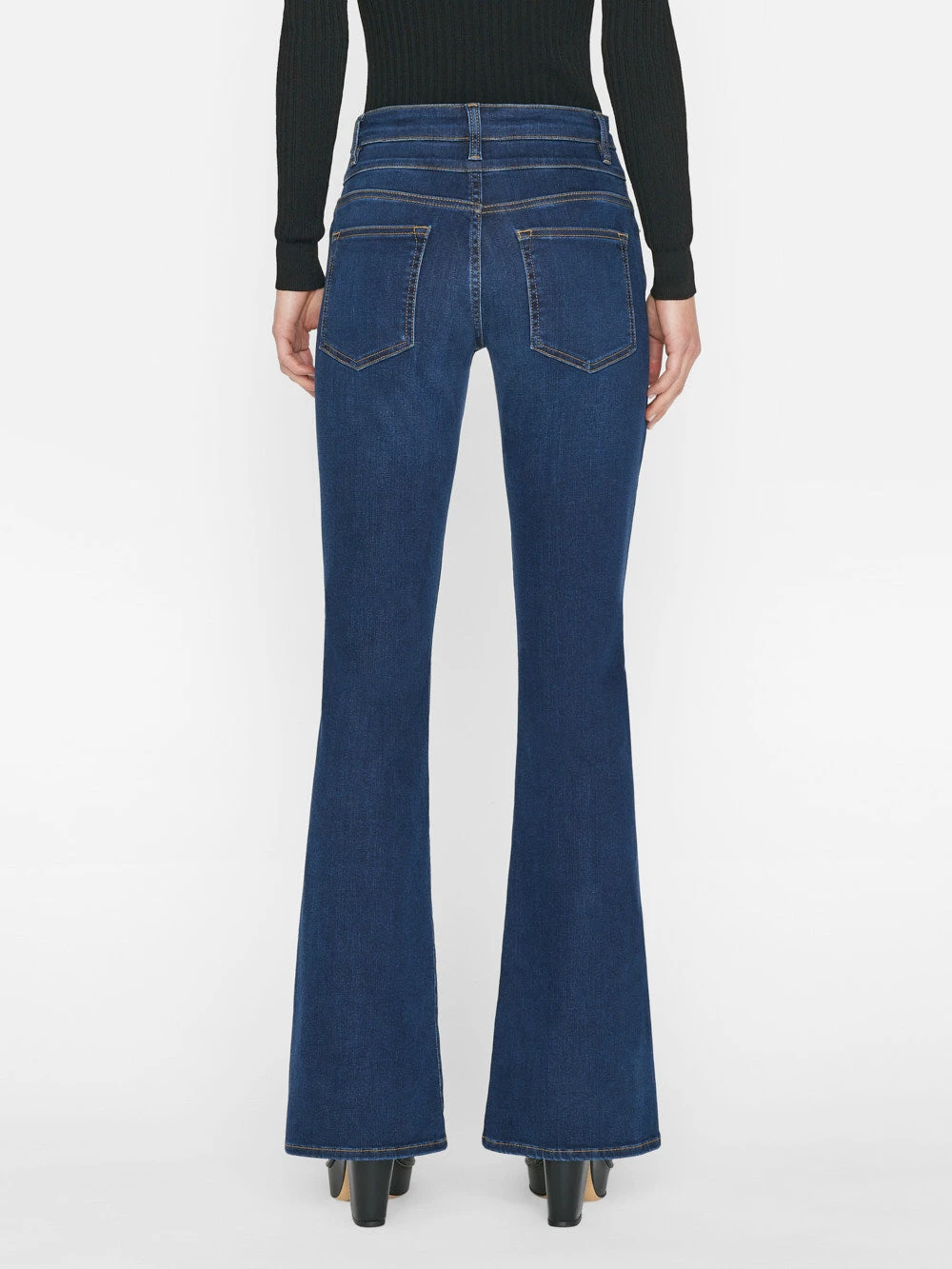 A FRAME signature jean with double waistband detailing, form-fitting silhouette through the leg, and generous flare from the knee. Crafted from a sustainable stretch cotton blend with the softest hand.