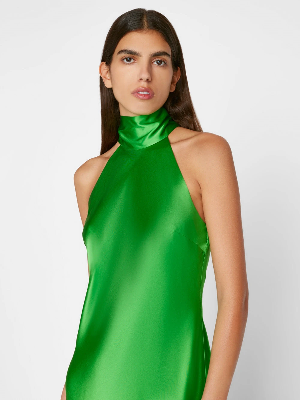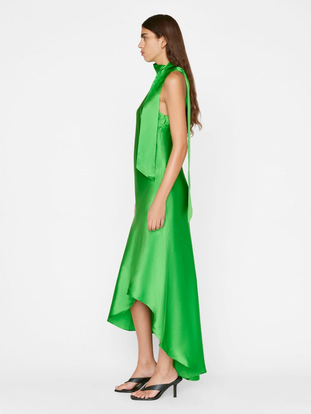 Please note: This is a Sale style. A $12 restocking fee applies for any return that includes Sale styles, deducted from the refund total. Incredibly flattering and as sophisticated as it is fun to wear, this silk charmeuse dress in Bright Peridot features an asymmetrical hem and a tie detail that can be worn in a bow at the halter neck, draped like a scarf, or tied with a minimal knot and worn loose.