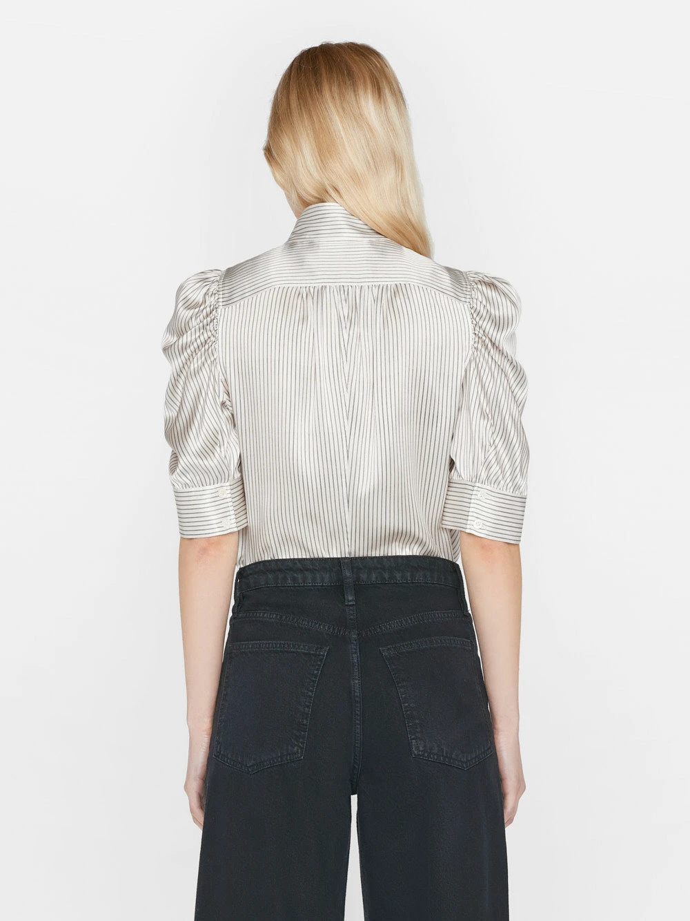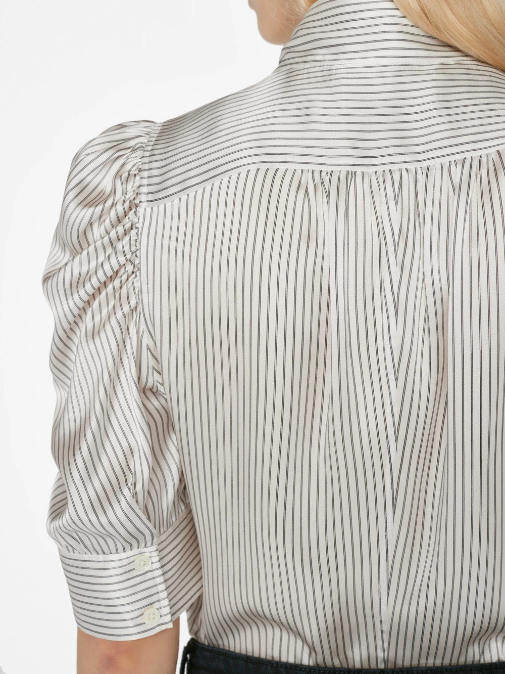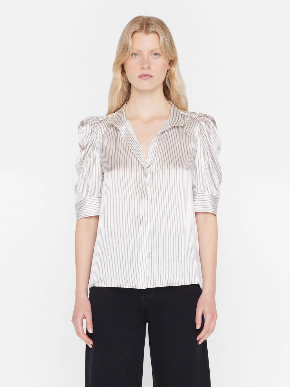Bestselling FRAME style designed with a high neck collar, feminine puff sleeves, concealed button down placket, and cuffed short sleeves. Crafted from an ultra-luxurious 100% silk with a subtle gloss.