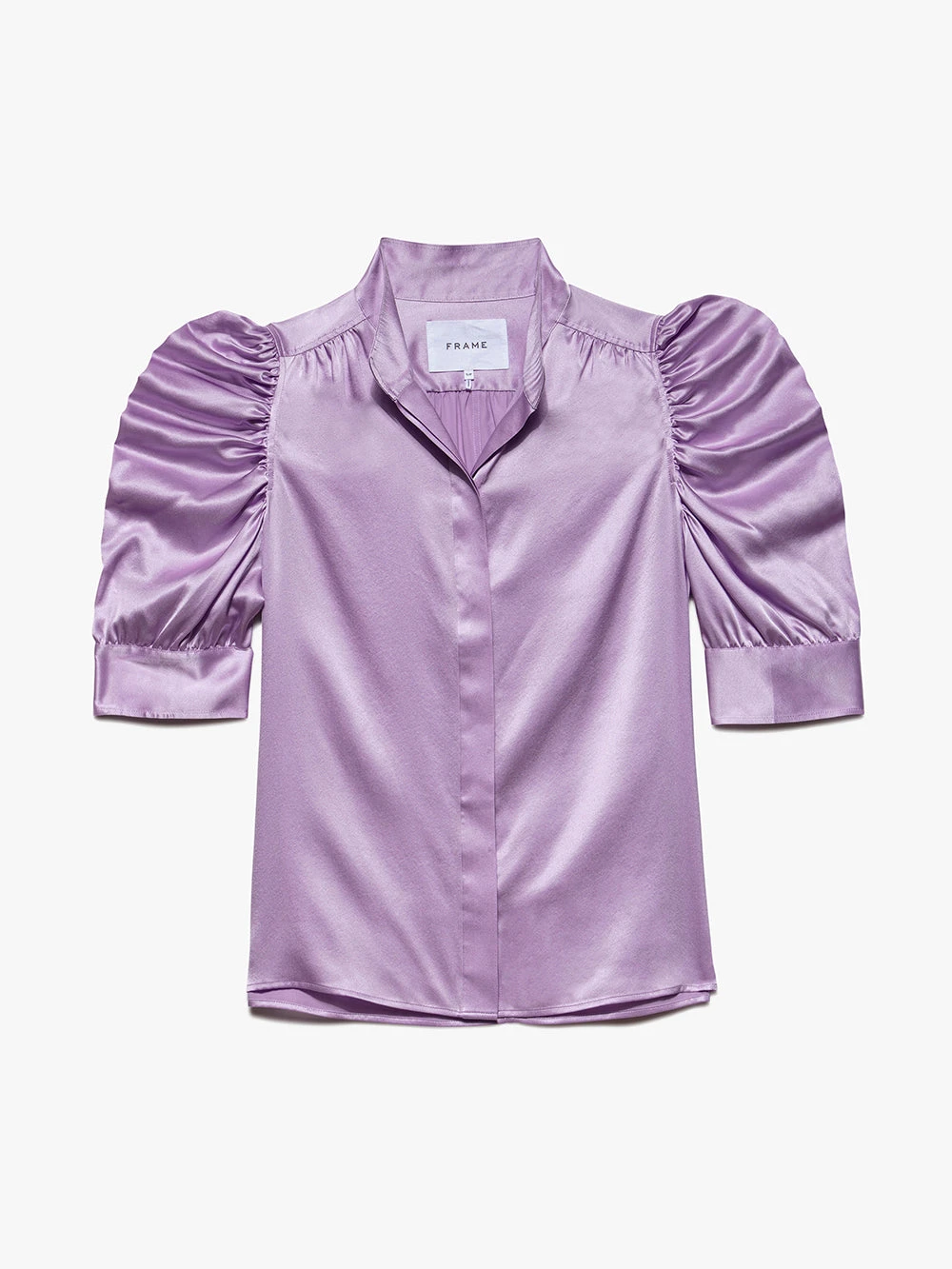 This shirred-shoulder top in shiny silk charmeuse epitomizes modern femininity, from the high neckline to the boldly puffed sleeves. We love it juxtaposing vintage-inspired denim, or with leather pants and a slim belt.