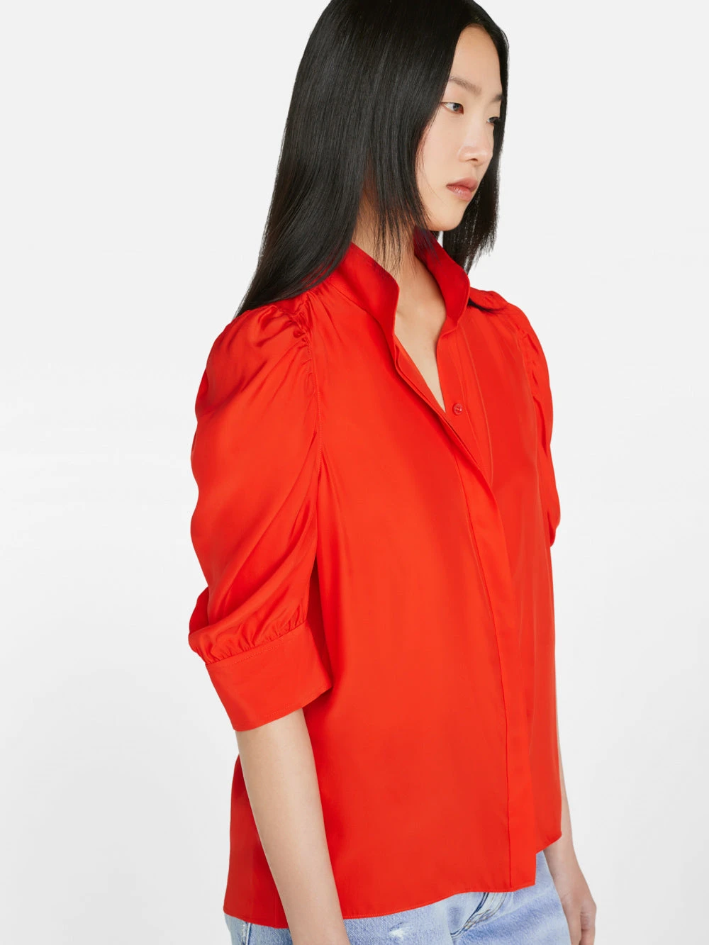 This shirred-shoulder top in shiny silk Charmeuse epitomizes modern femininity, from the high neckline to the boldly puffed sleeves. We love it juxtaposing vintage-inspired denim, or with leather pants and a slim belt.