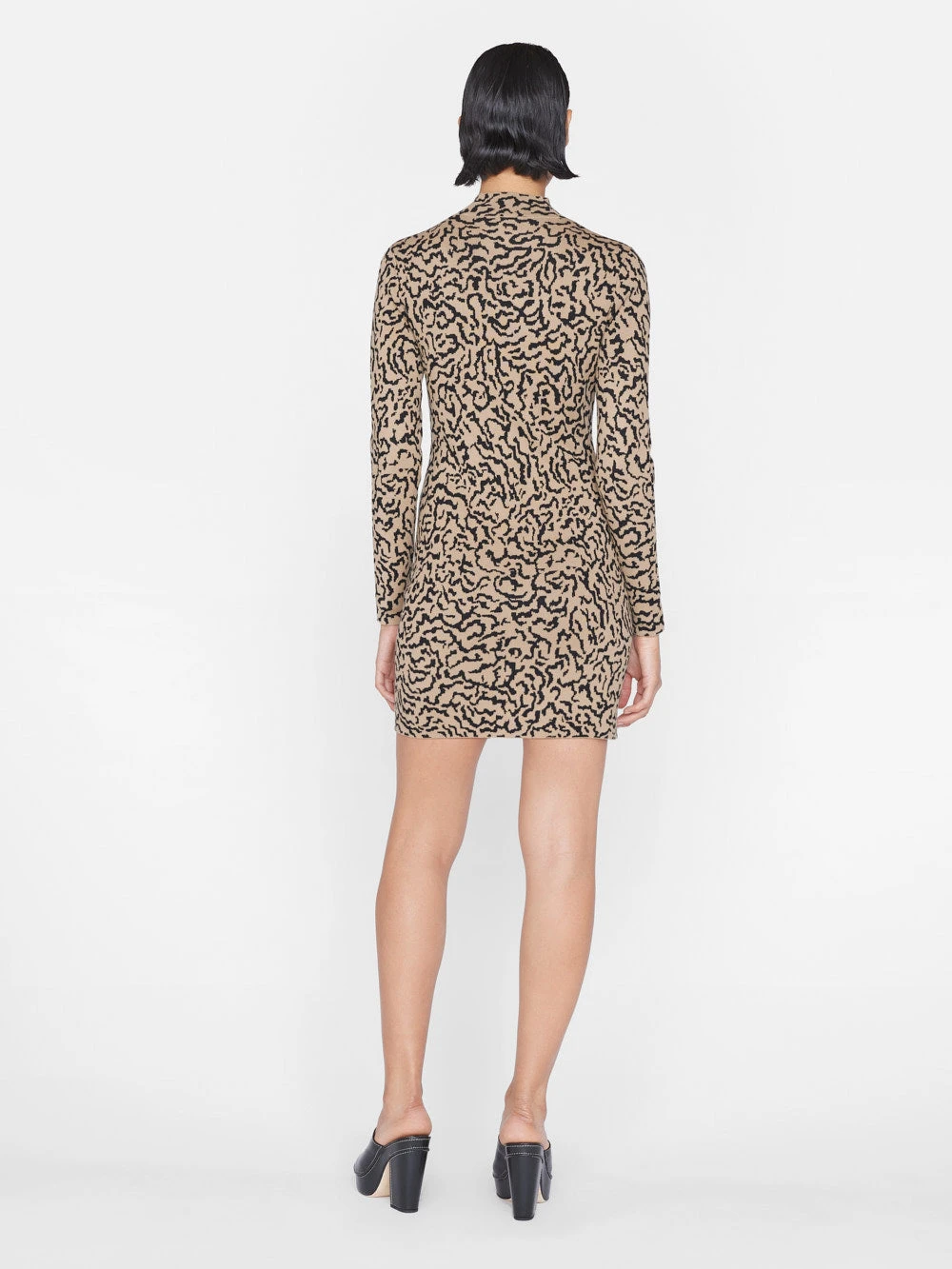 A body-hugging modular mini dress with petite mock neck and long sleeves. This sweater dress features a new abstract animal print to give an elevated update to your traditional prints. Crafted from a stretch jacquard that offers a flattering smoothing effect.
