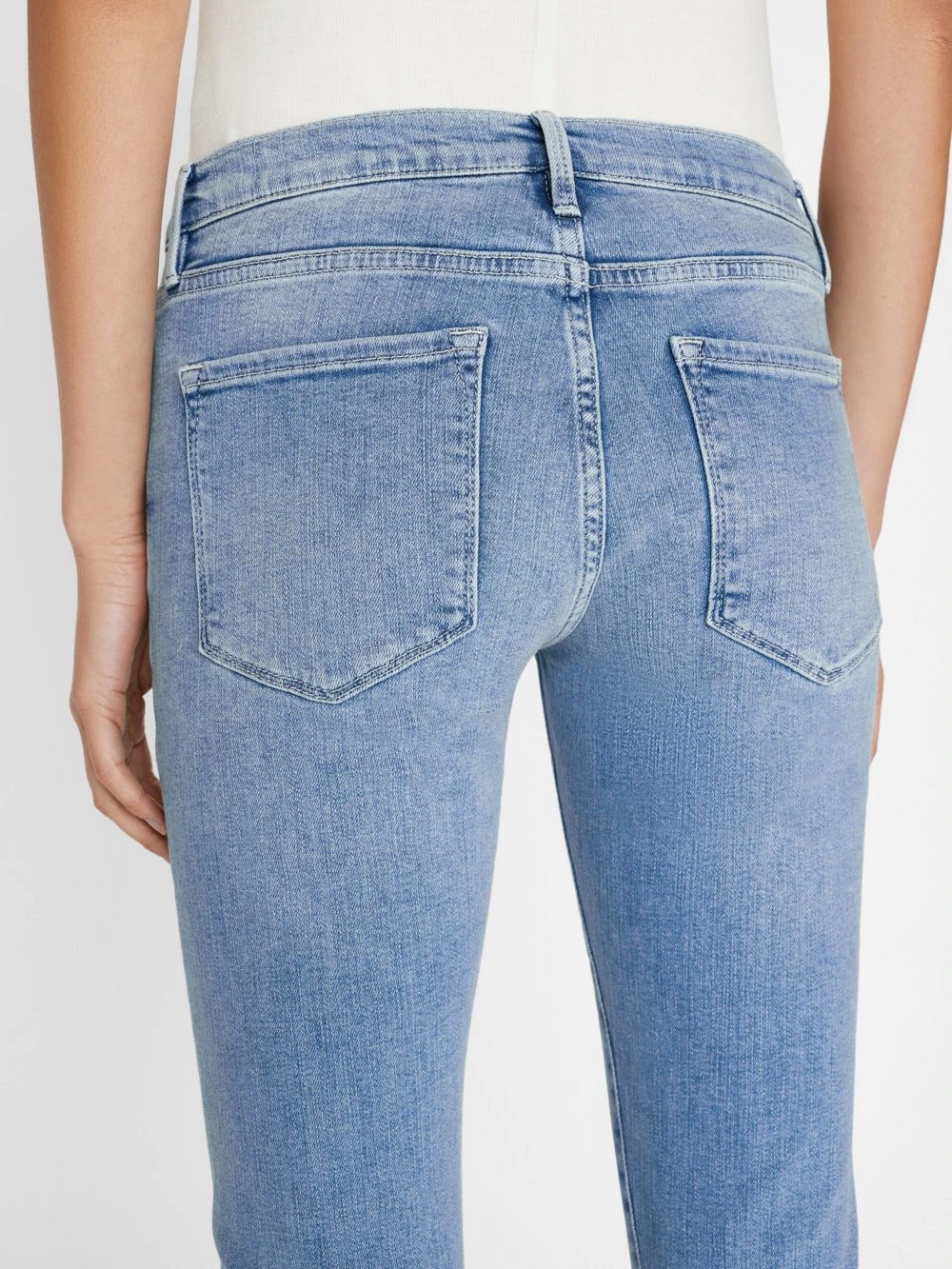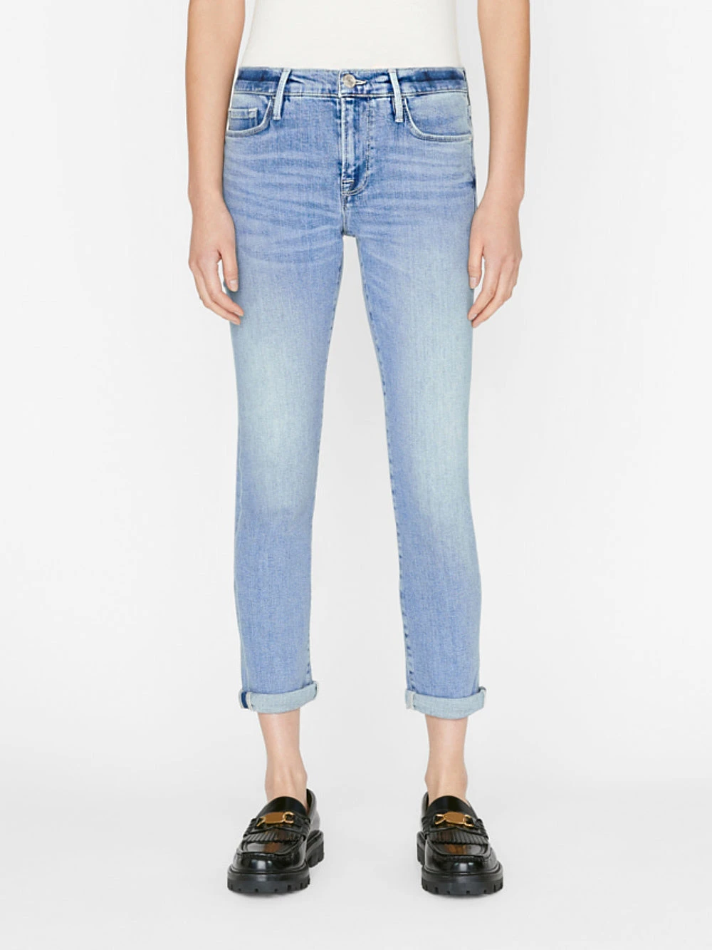 Please note: This is a Sale style. A $12 restocking fee applies for any return that includes Sale styles, deducted from the refund total. A coveted FRAME fit, this mid-rise skinny jean is a slouchier take on the classic boyfriend silhouette. The curved waist features a slightly higher rise in the back, for a comfortable hip-slung fit. This pair is crafted from super stretch denim in a light-blue wash, and finished with a cuffed hem.
