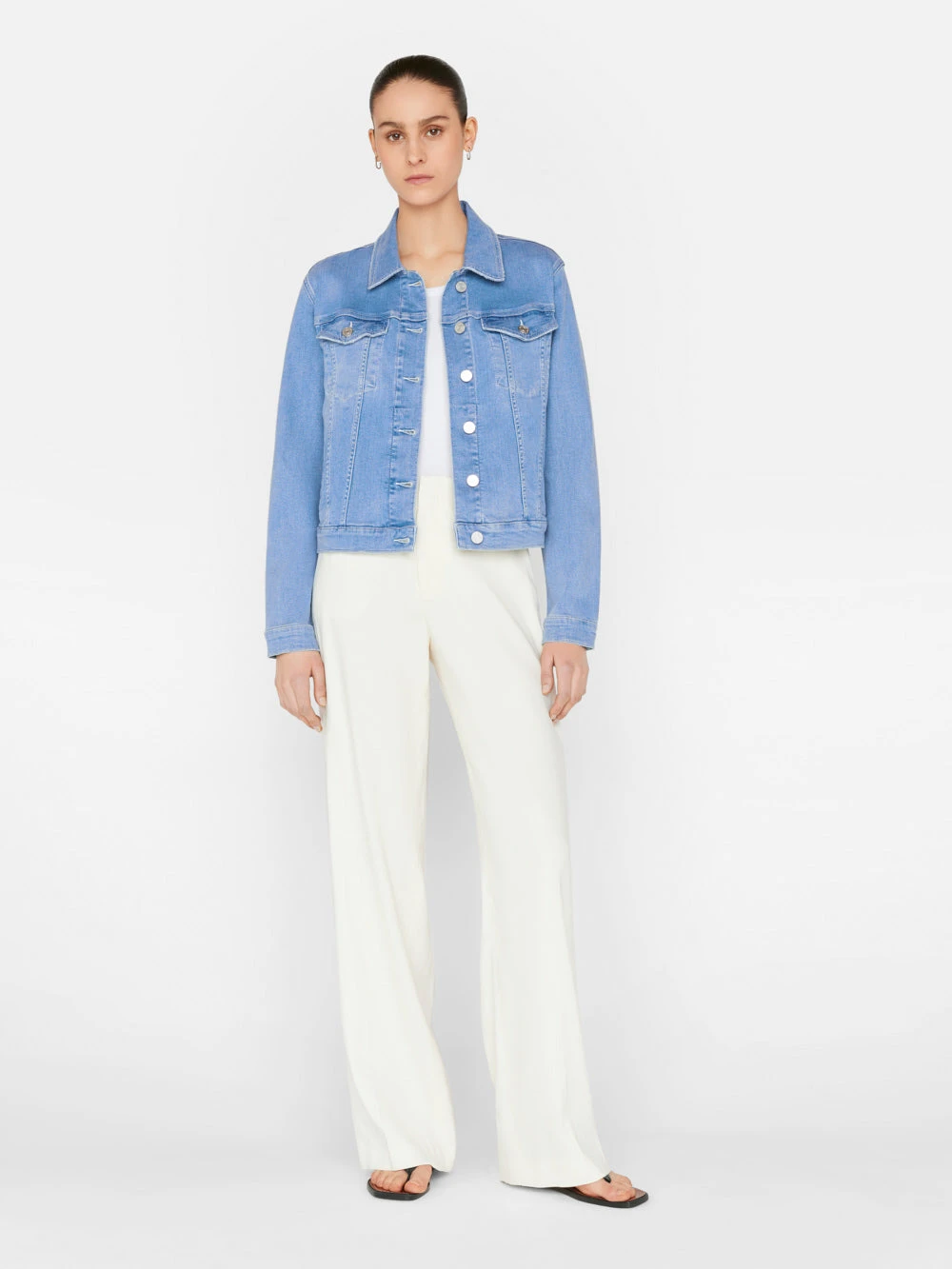 The signature FRAME denim jacket silhouette, Le Vintage is crafted from super stretch denim in a light, bright blue wash. A classic silhouette with modern fit updates, this year-round essential makes summer layering effortless. Cuff the sleeves to keep it casual, or juxtapose with a feathered mini skirt.