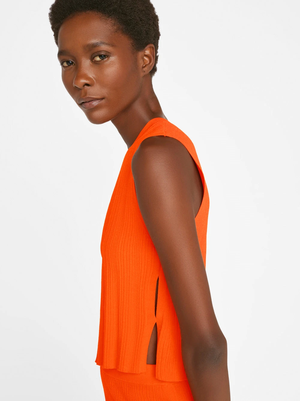 Done in brillant ribbed Nectarine fabric with a slight sheen, this tank features cutout details at the side seams, to approximate a double keyhole detail. Paired with the matching Mixed Rib Cutout Skirt, this tank makes summer set dressing seriously chic.