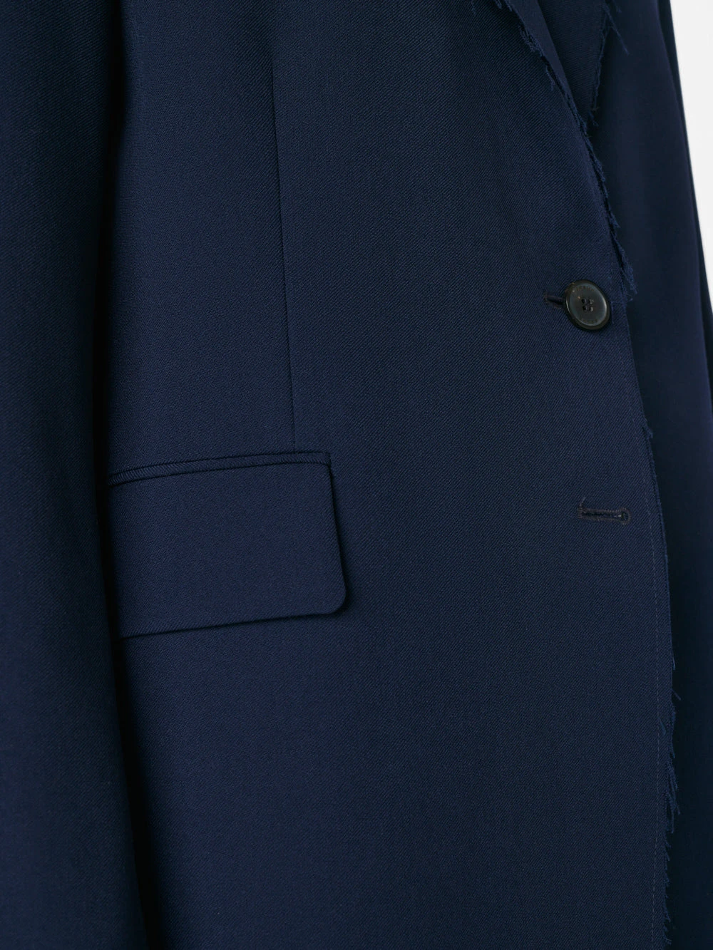 A wardrobe staple updated for a modern look and feel, this single-breasted, two-button blazer features an oversized fit, functional flap pockets, and a raw edge hem that lends the classic silhouette a little edge. Done in classic Navy—perfect for pairing with white denim or styling over a neutral slip dress.