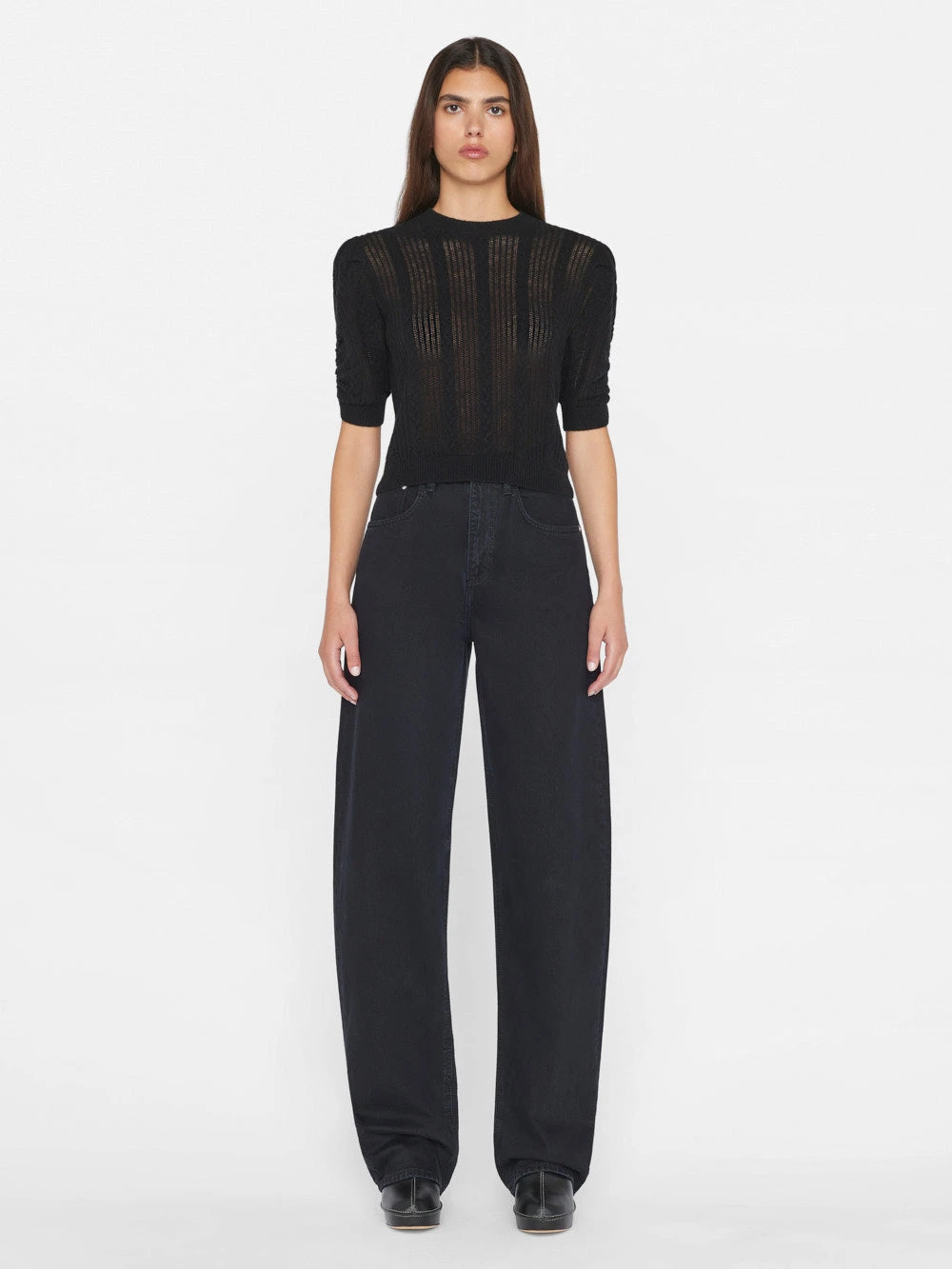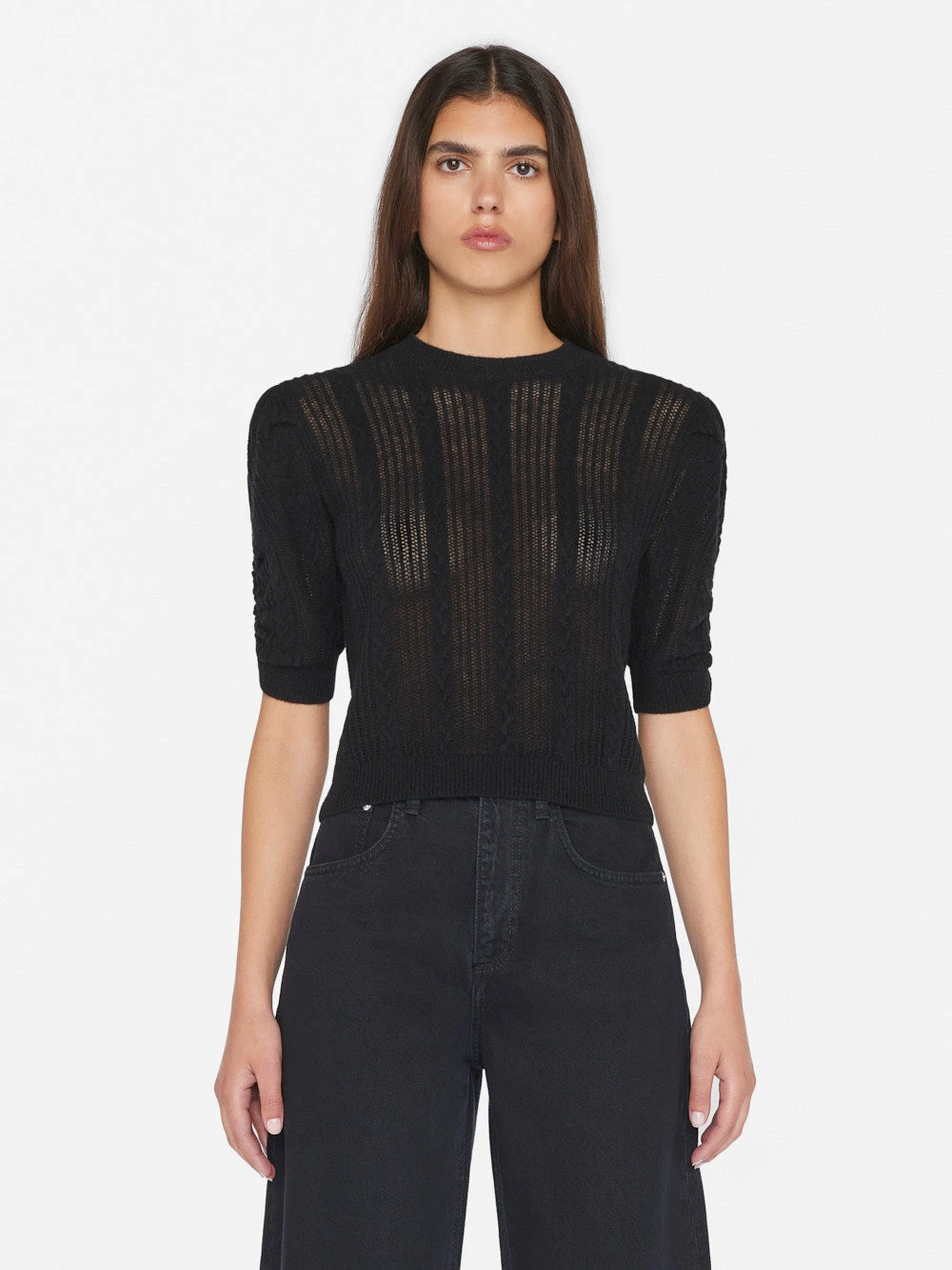 Short sleeve sweater designed with ruched sleeves, oversized pointelle details, and ribbed crewneck, hem, and cuffs. Designed in a delicate cashmere wool blend, sustainably sourced from recycled materials.