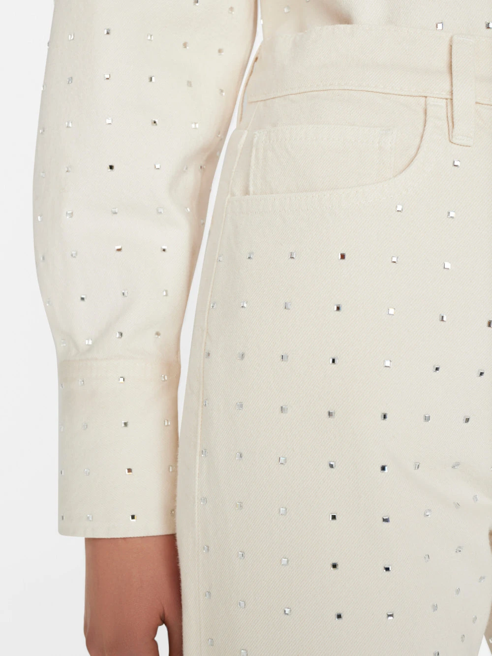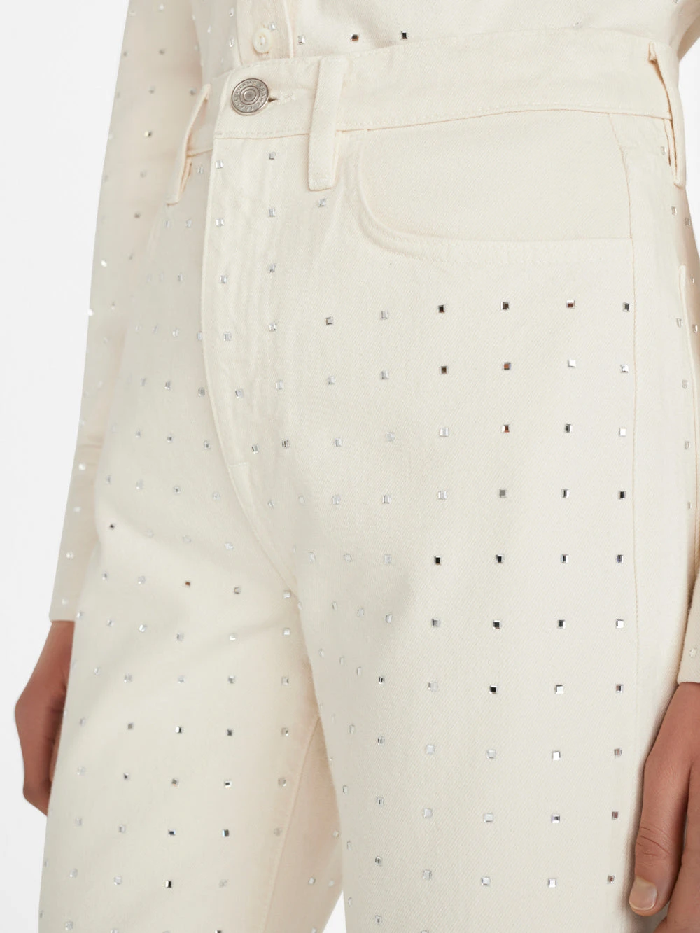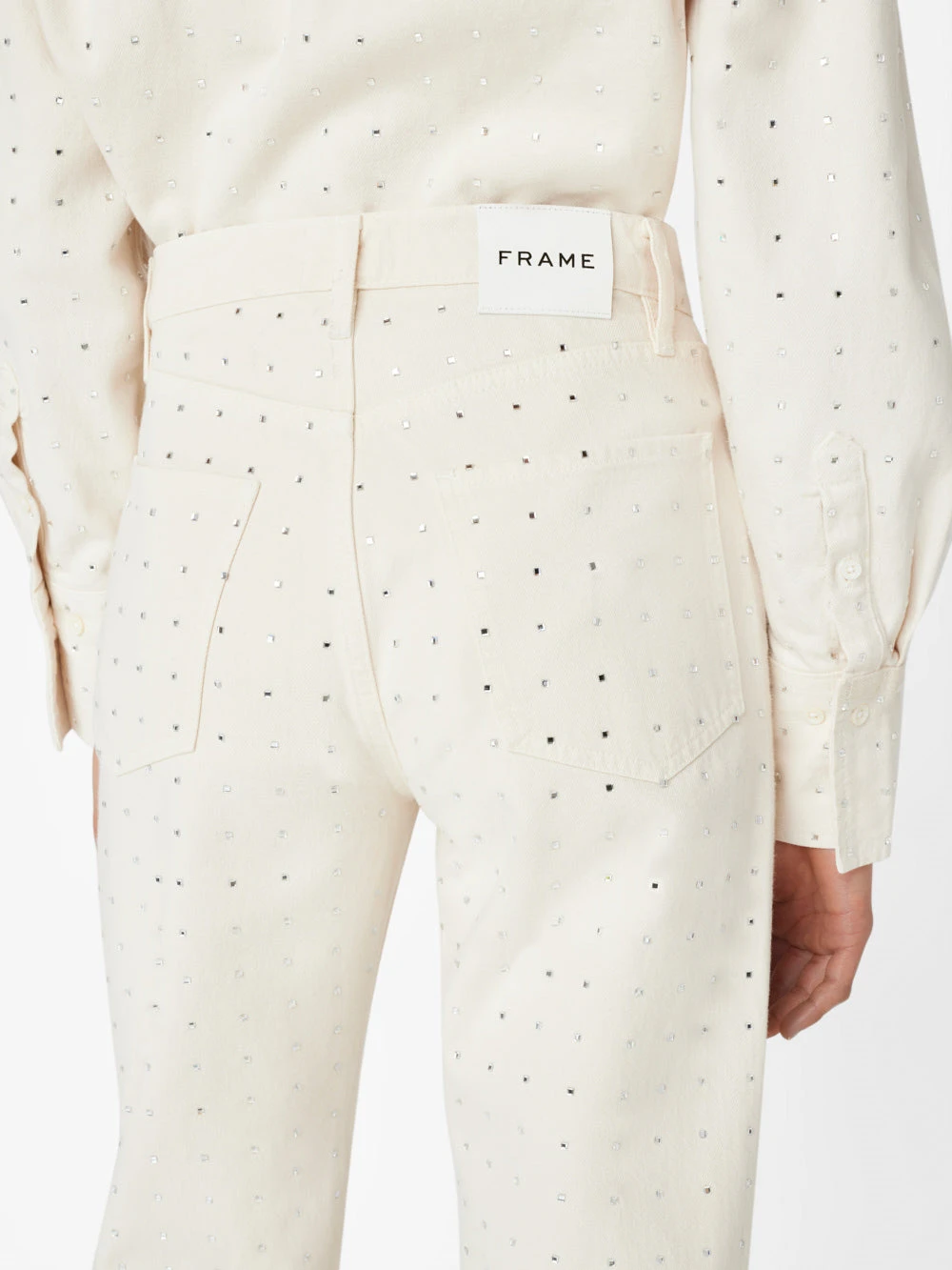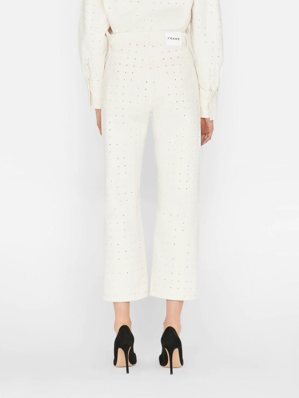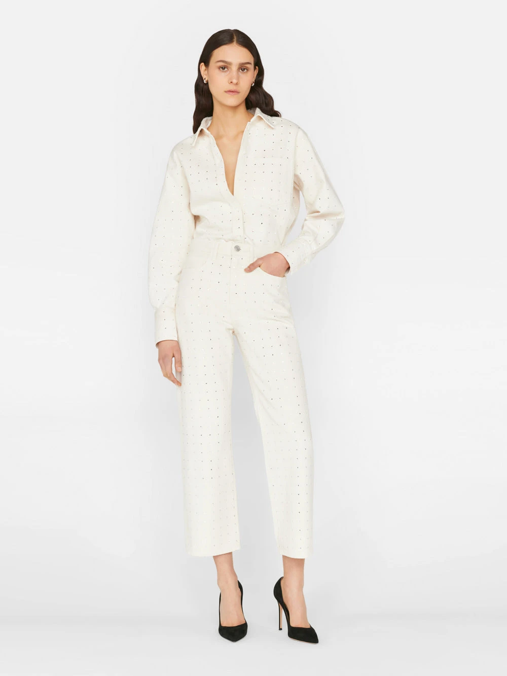 The ultimate dress-up denim, this head-turning take on our bestselling Le Jane Crop fit is summer’s hottest party pant. Crafted from rigid Bone denim, and adorned with 360° of light-catching rhinestones. Due to their delicate nature, each pair comes with a sachet of extra stones, in case one goes missing on the dance floor.