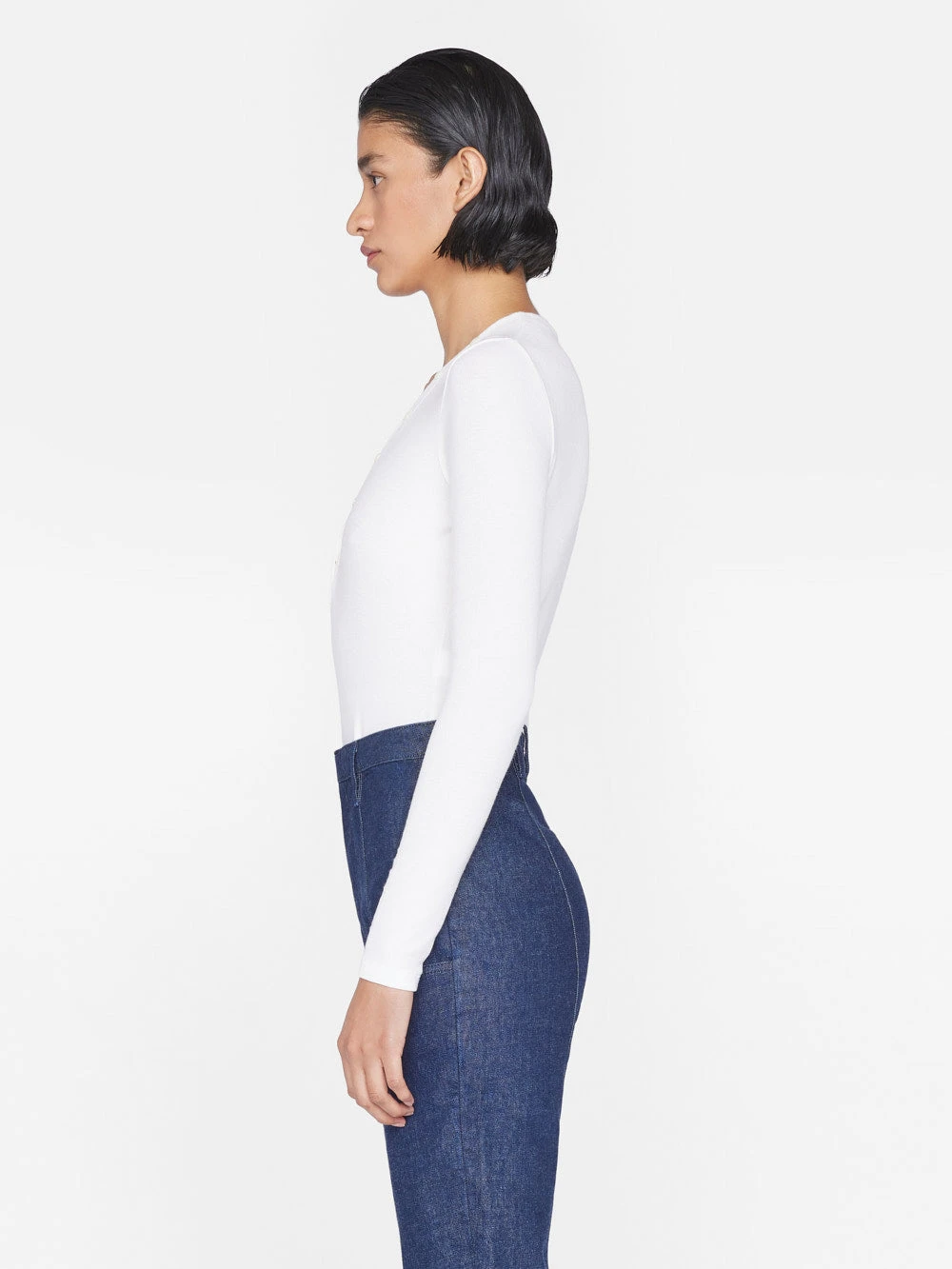A long sleeve ribbed henley with discrete, asymmetrical button detailing at the deep v-neck collar and subtle center stitch at the back. Stretch modal offers an ultra-pliable fit that smooths and tucks into your favorite pair of jeans.