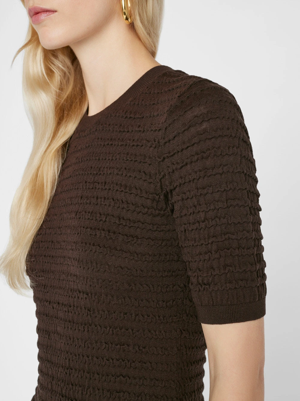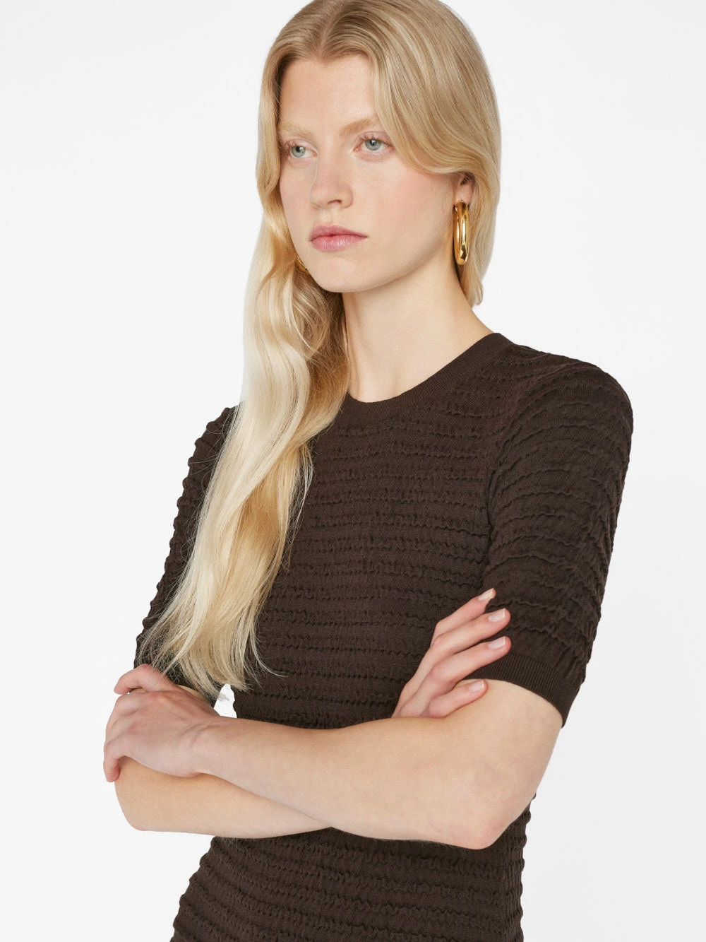 Short sleeve t-shirt dress with crew neck, cuffed sleeves, and midi length. Designed in a ’90s-reminiscent smocked knit made with a silk cotton blend.