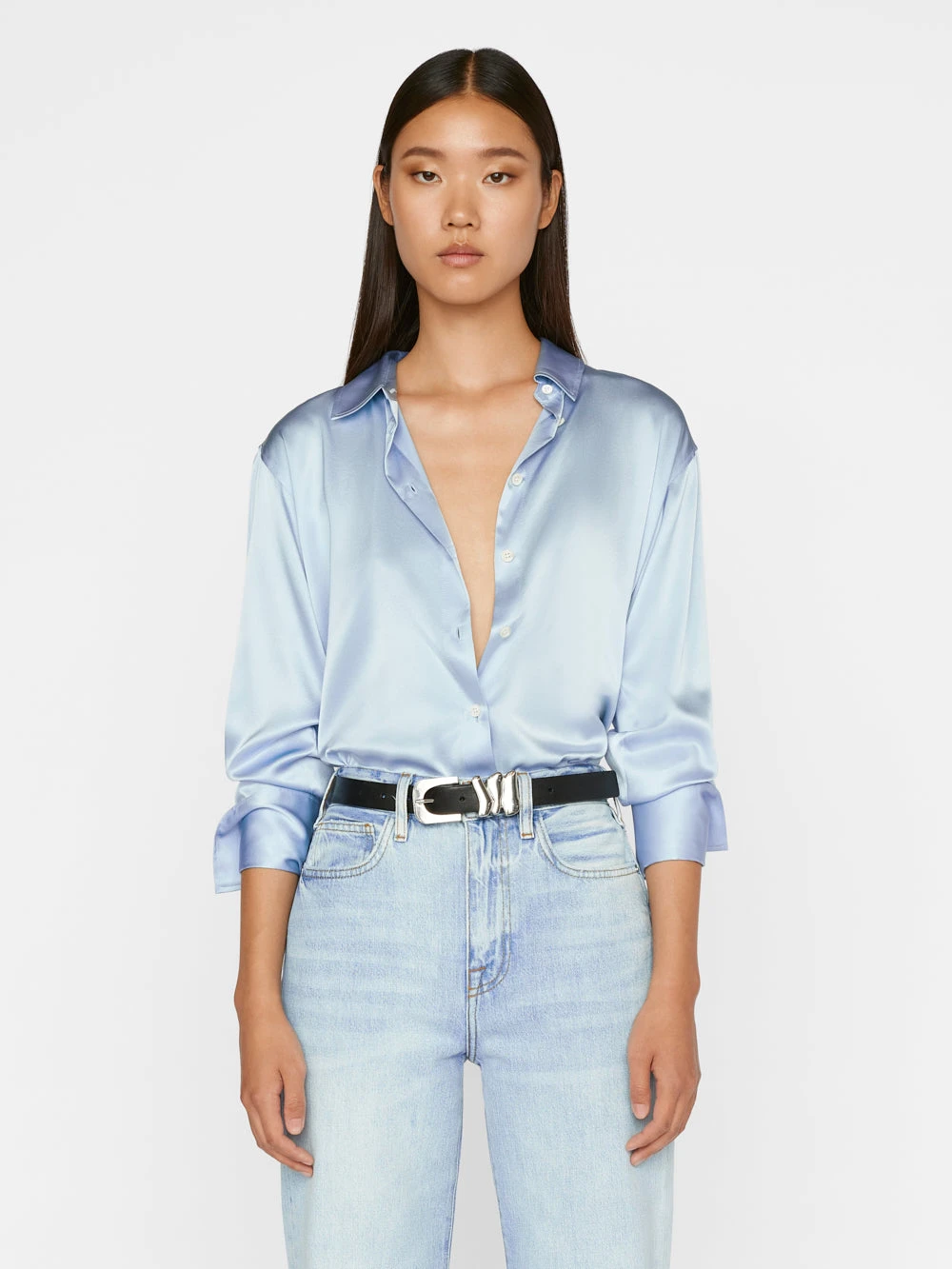 Please note: This is a Sale style. A $12 restocking fee applies for any return that includes Sale styles, deducted from the refund total. Size down if you prefer a more fitted look. With a modern, straight fit and a curved hem that’s slim enough to tuck and pretty enough to wear loose, this supple stretch silk top in icy Chambray Blue is a striking closet staple. Style it under blazers and leather jackets, over a bralette with a few extra buttons undone, and solo with denim and trousers.